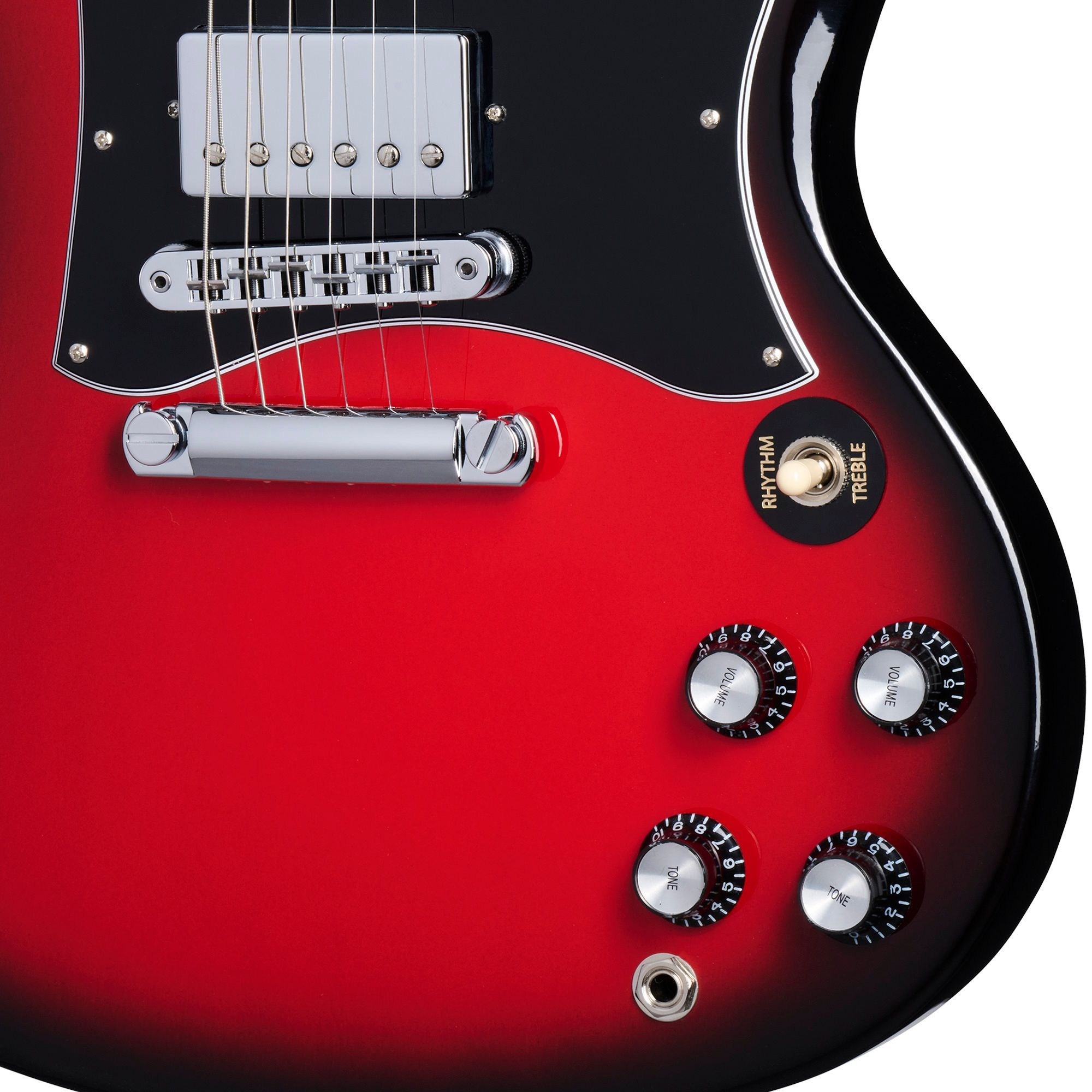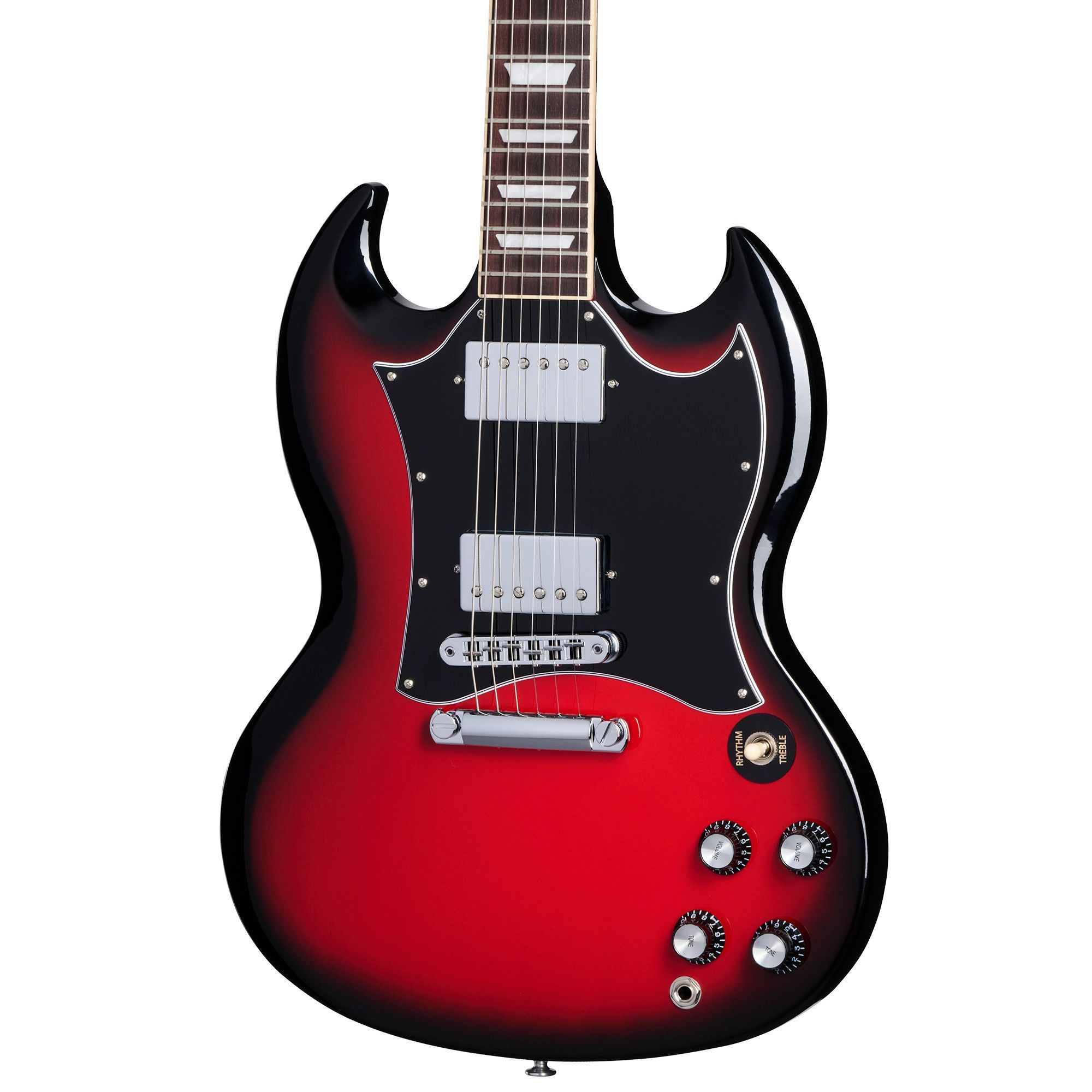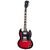 Gibson SG Standard - Cardinal Red Burst Korpus: Mahagoni Hals: Mahagoni Griffbrett: Palisander mit Binding Mensur: 62,8 cm ( 24.75'' ) Sattelbreite: 43 mm Halsprofil: Rounded Griffbretteinlagen: Trapez, Acryl 22 Medium Jumbo Bünde Sattel: Graph Tech Pickguard: schwarz, 5-lagig Tonabnehmer: 1 x 490R