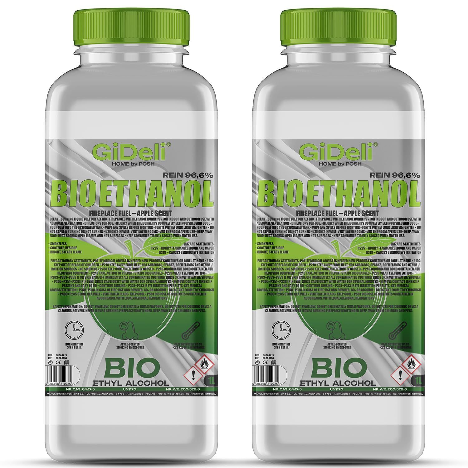 GiDeli bioethanol 2 x 1l Apfelduft 96,6% Ethanol für Innen & Außenkamine