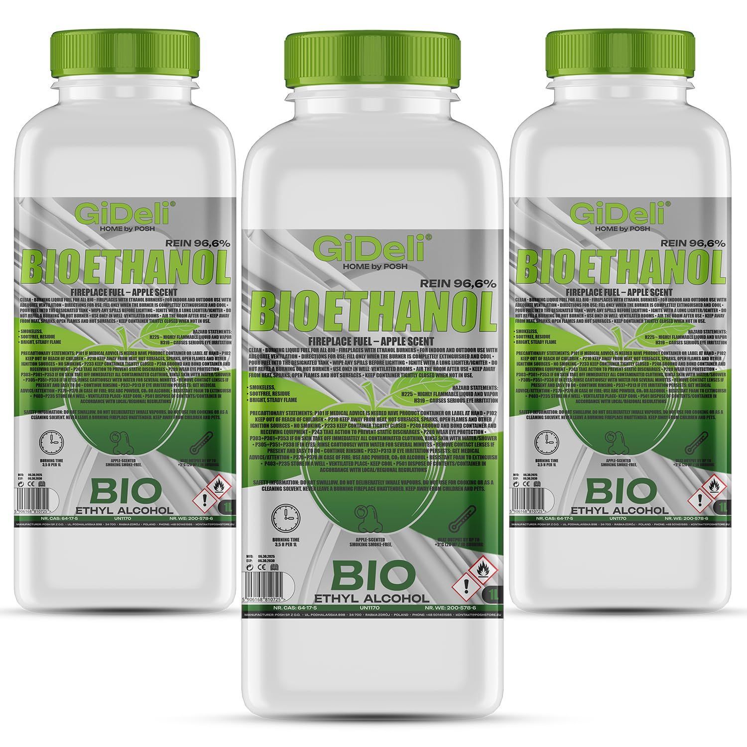 GiDeli bioethanol 3 x 1l Apfelduft 96,6% Ethanol für Innen & Außenkamine