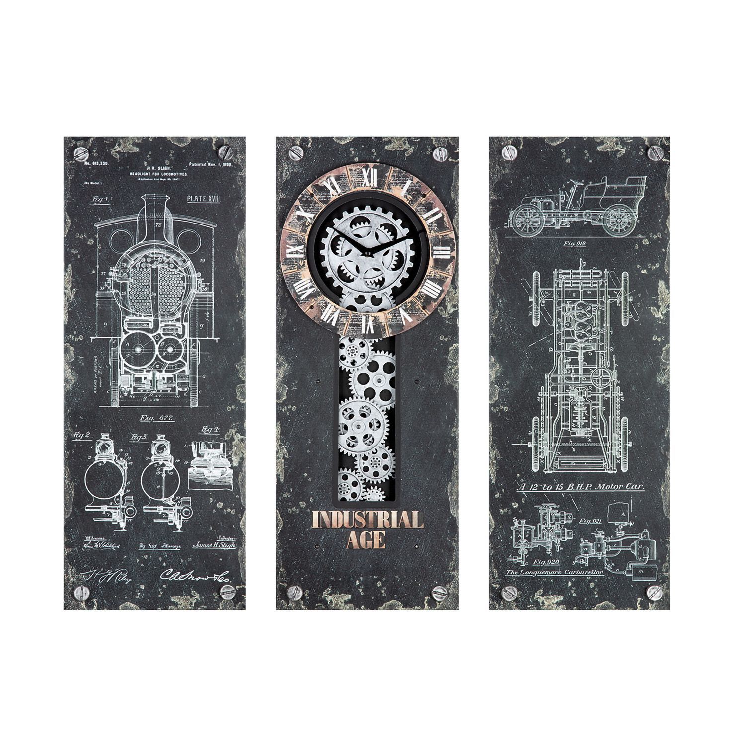 Gilde Gilde 3tlg. Set, Wanduhr, rechteckig, "Steampunk", Zahnradmotiv, Metall, schwarz,