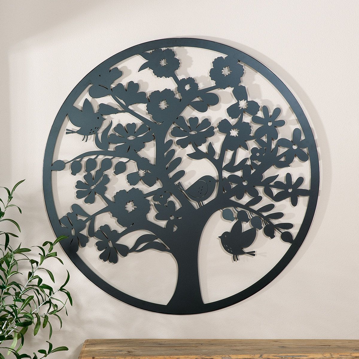 Gilde Gilde Wandrelief, rund, "Blütezeit", Baummotiv, Vogelmotiv, Metall, schwarz, VE