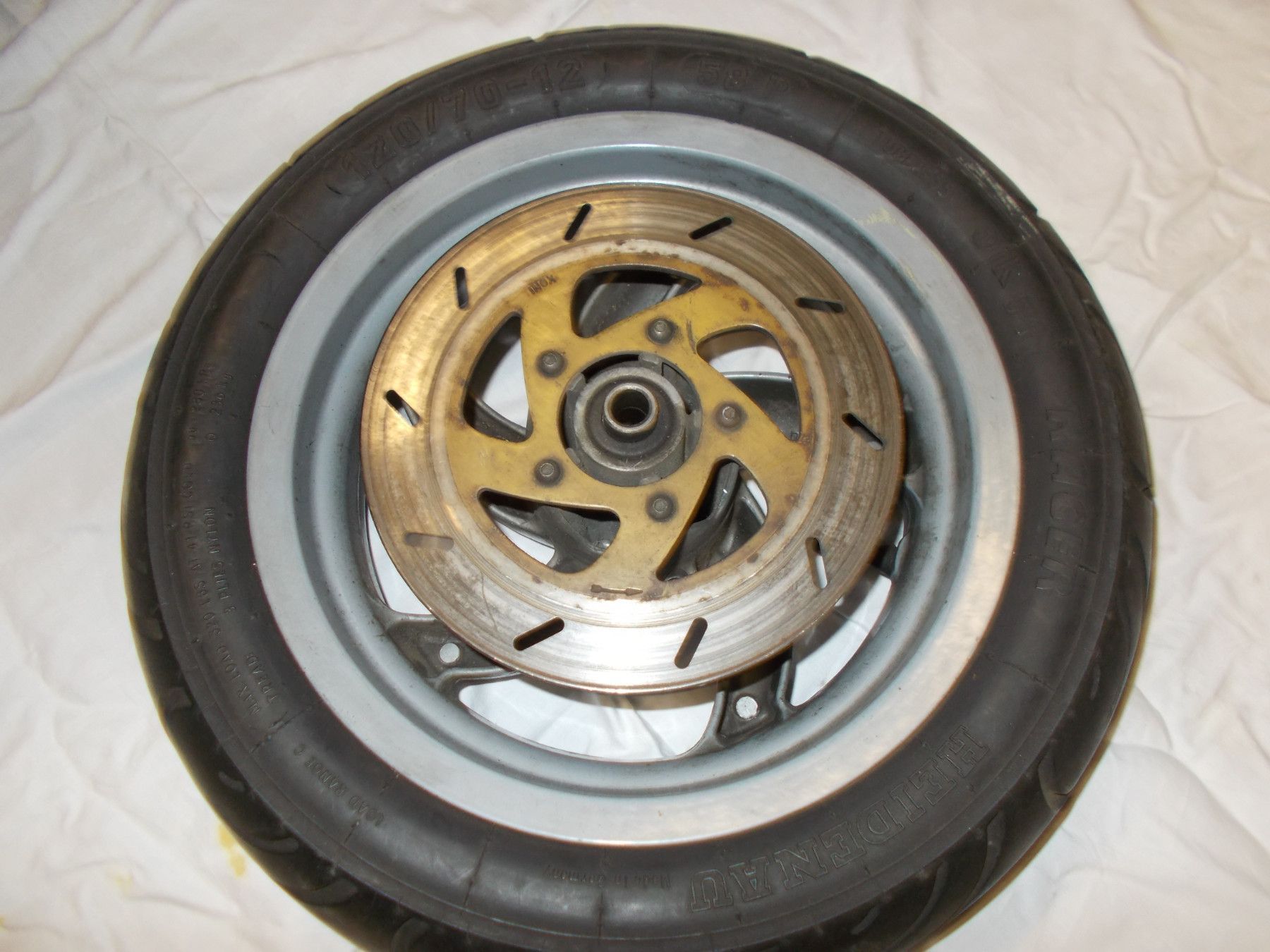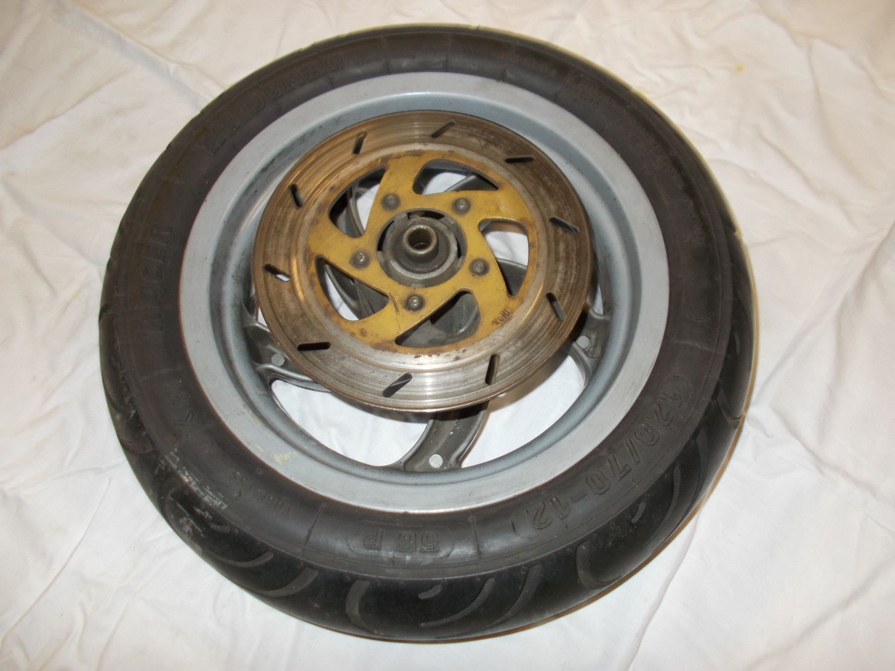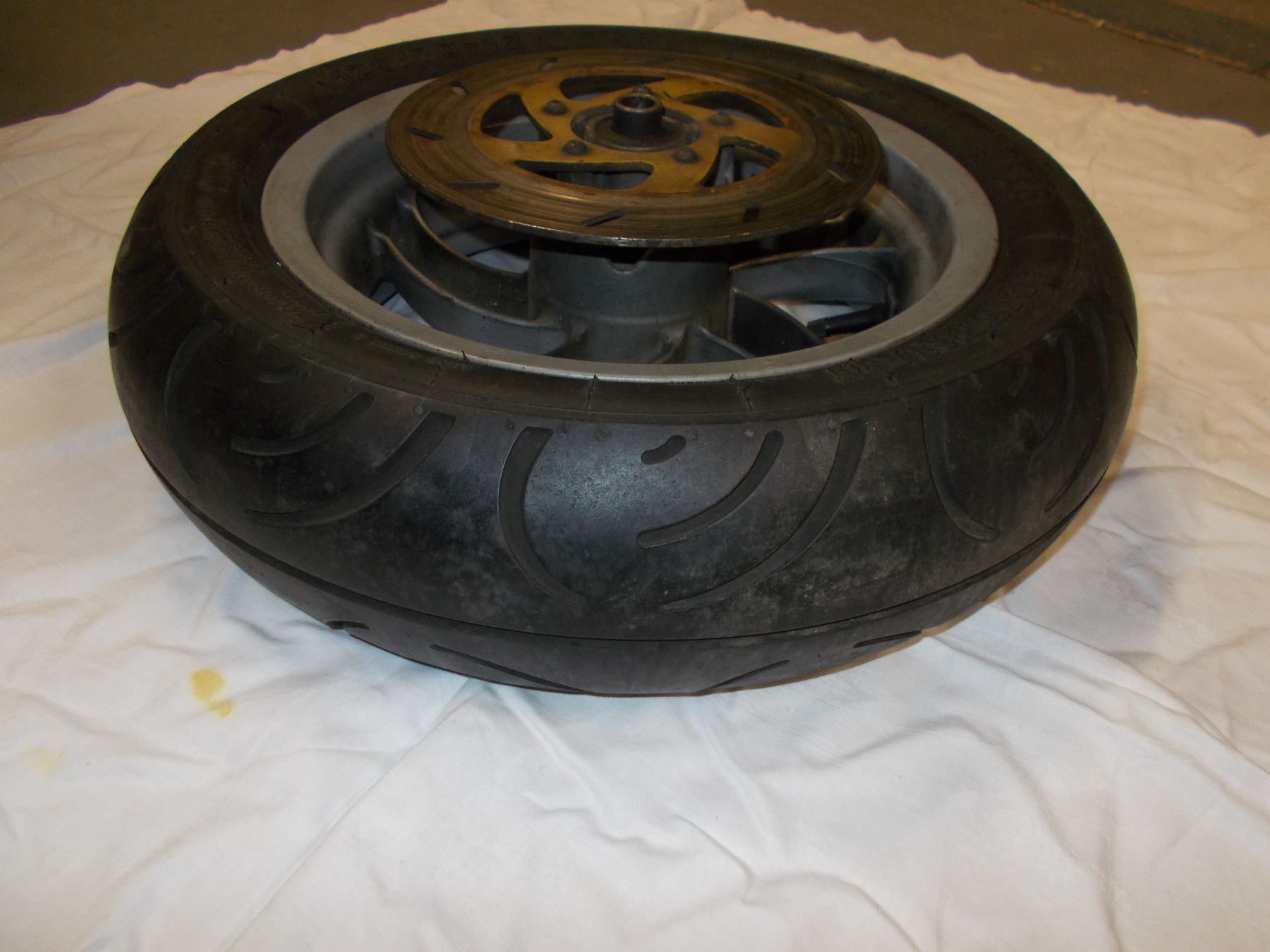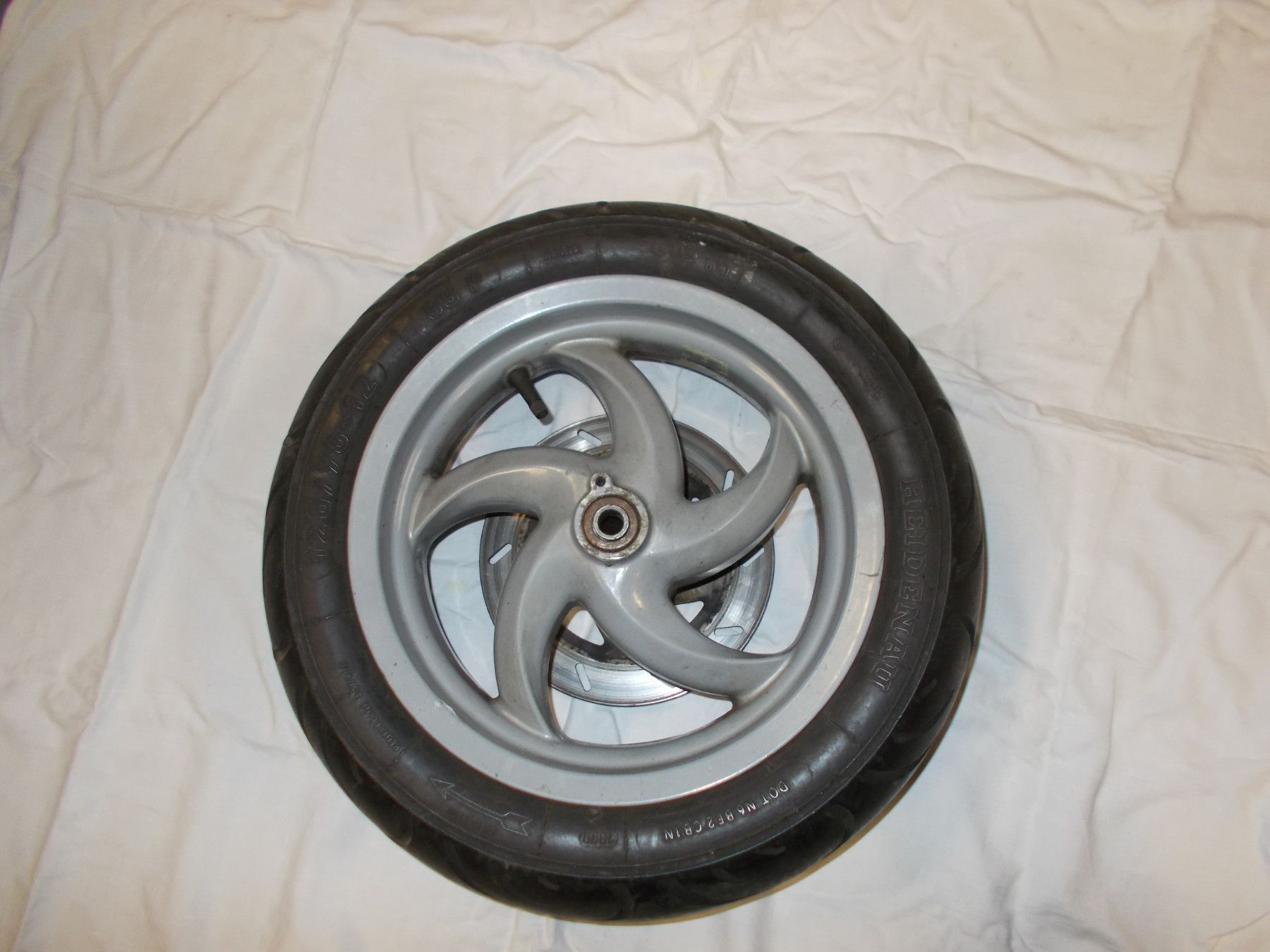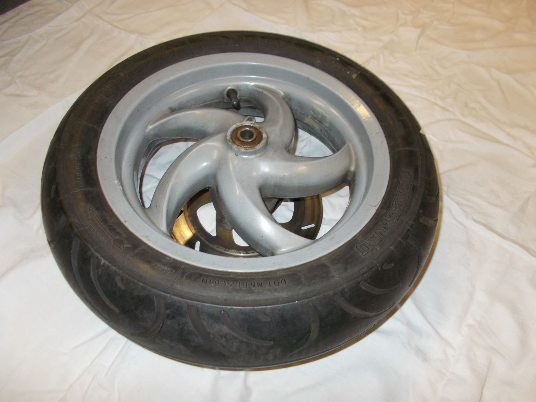 Gebrauchte vordere Felge incl. Bremsscheibe und Bereifung von einem Motorroller Gilera (Piaggio) Runner 50. Auch passend beim 125 oder 180ccm Modell. Bitte die Felge vergleichen da es zwei verschiedene Felgen gibt. Die Aufnahme für den Tachoantrieb ist dann anders. Felge ist noch in recht gutem Zust