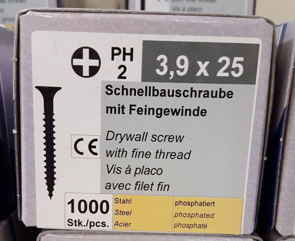 Schnellbauschrauben mit Feingewinde 3,5x25 mm (4000 St.) Anwendung: Direktverschraubungen von Gipskartonplatten auf verschiedenen Unterkonstruktionen wie Holz oder Metallständer bis 0,6 mm im Innenbereich. Einsatzbereich: Innenausbau, Trockenausbau, Renovierungen etc. Vorteile: Kein Vorbohren notwen