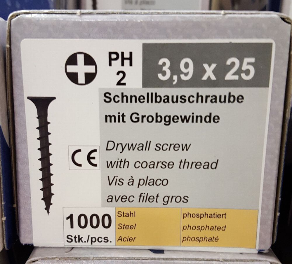 Schnellbauschrauben mit Grobgewinde 3,5x25 mm (4000 St.) Anwendung: Direktverschraubungen von Gipskartonplatten auf Holz im Innenbereich. Einsatzbereich: Innenausbau, Trockenausbau, Renovierungen etc. Vorteile: Kein Vorbohren notwendig Einsatzgehärtet