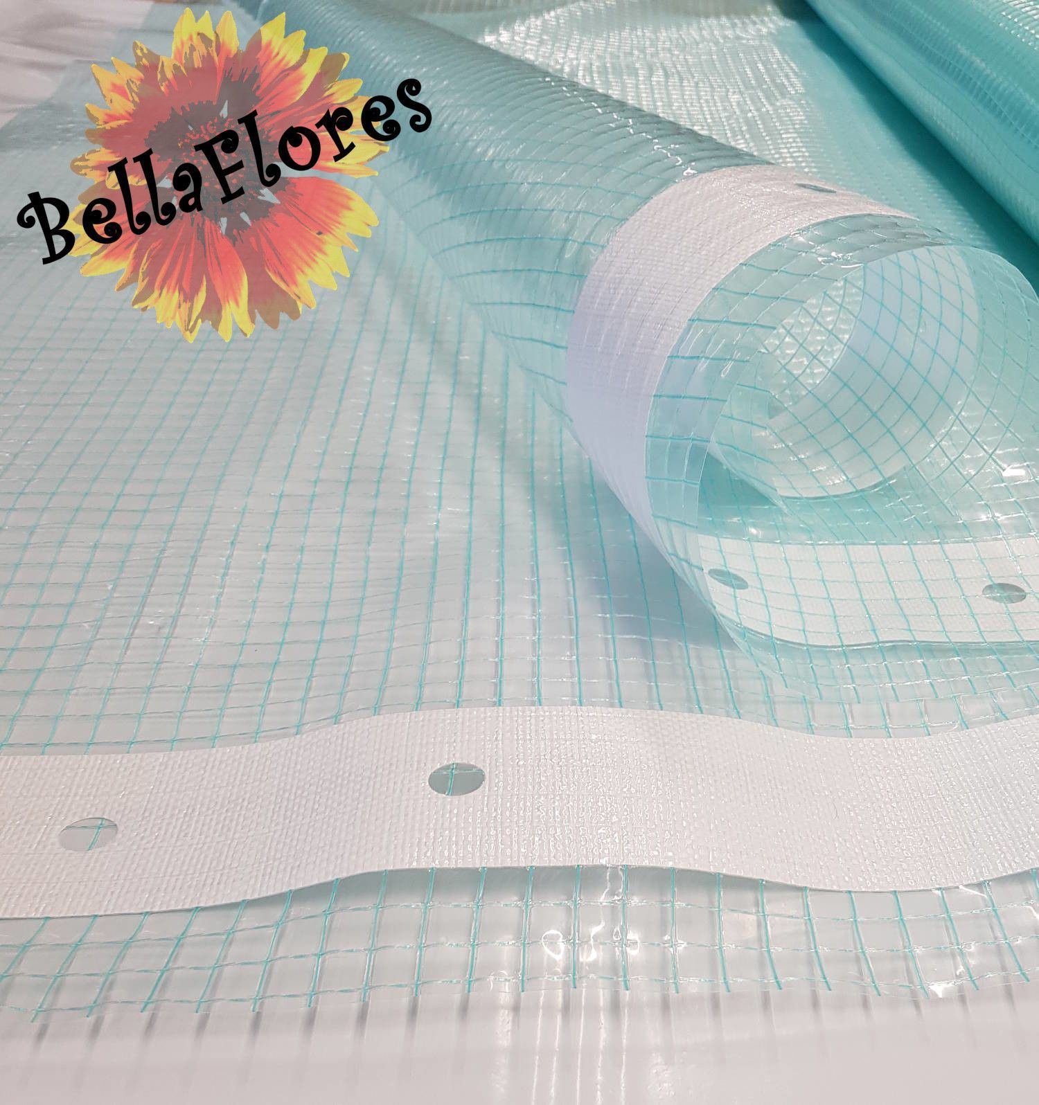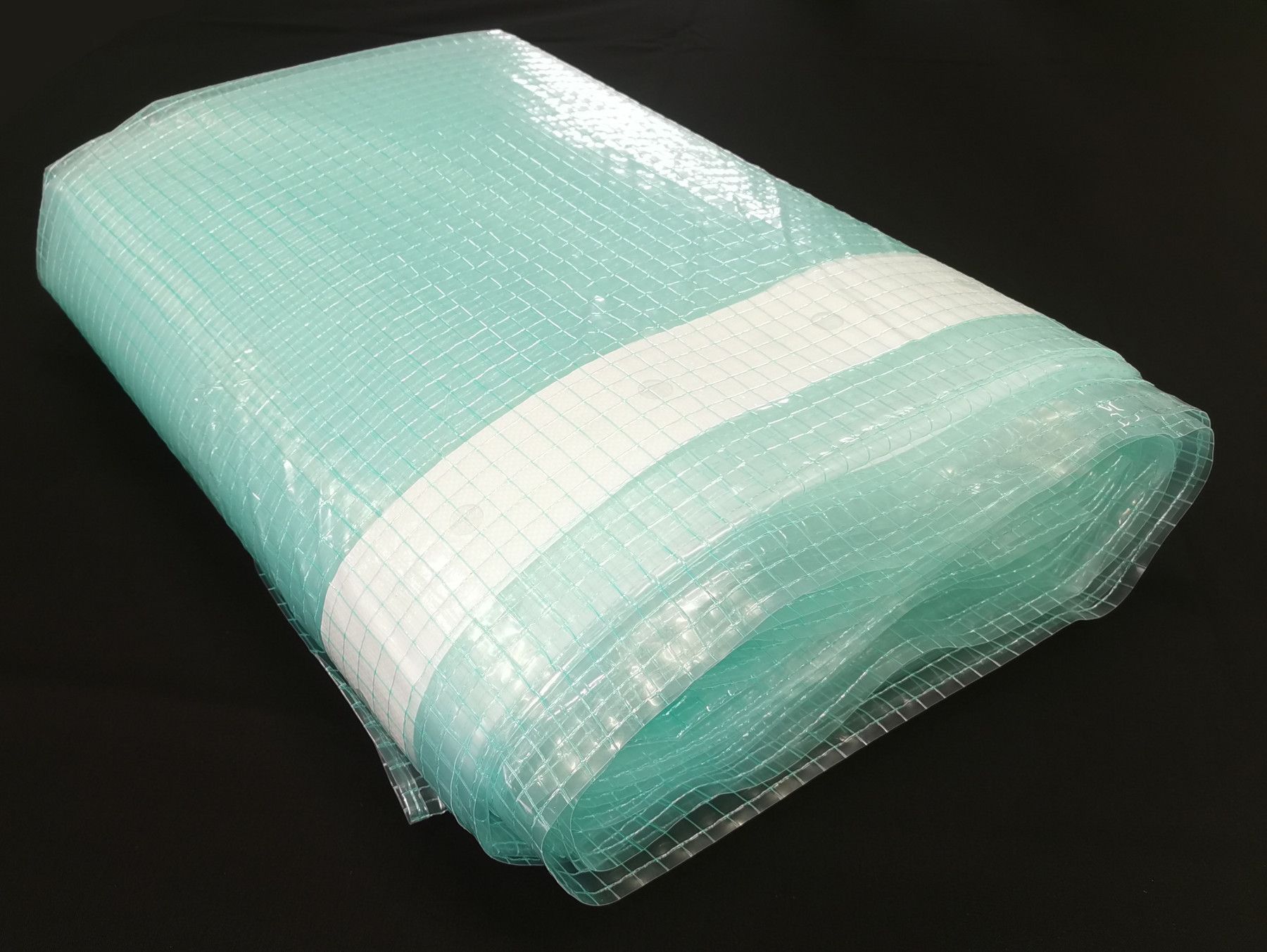 Grundmaterial: 3-Lagen-CoEx-Polyethylenfolie Farbe: transparent mit grünlichem Gitterfaden