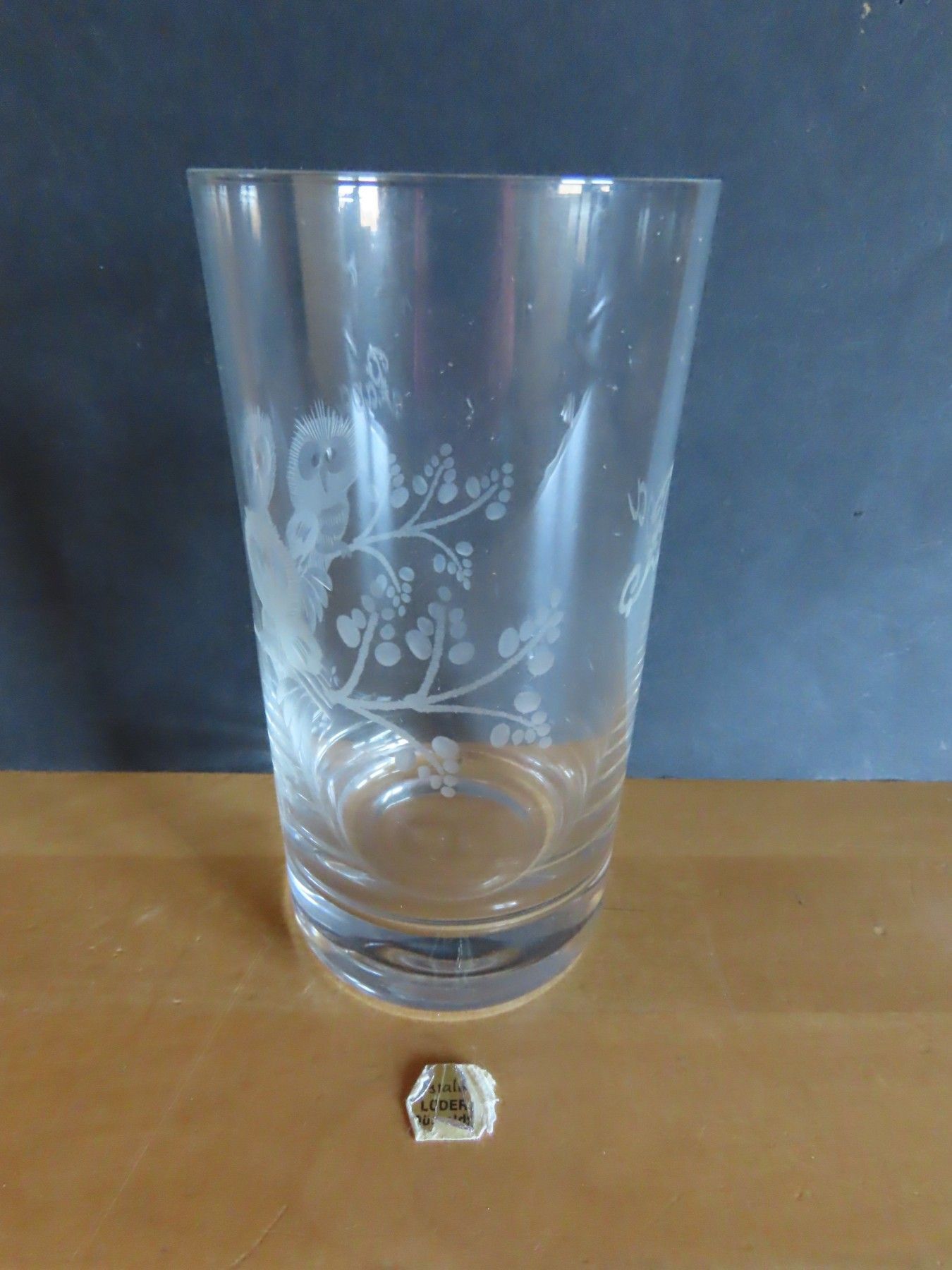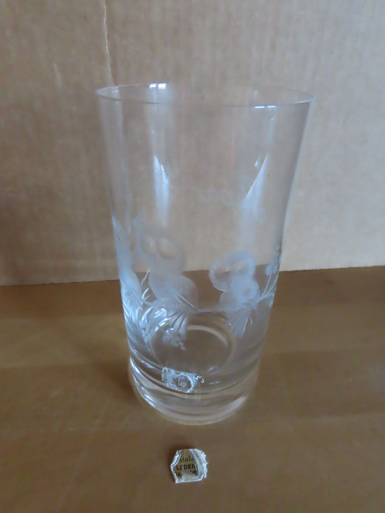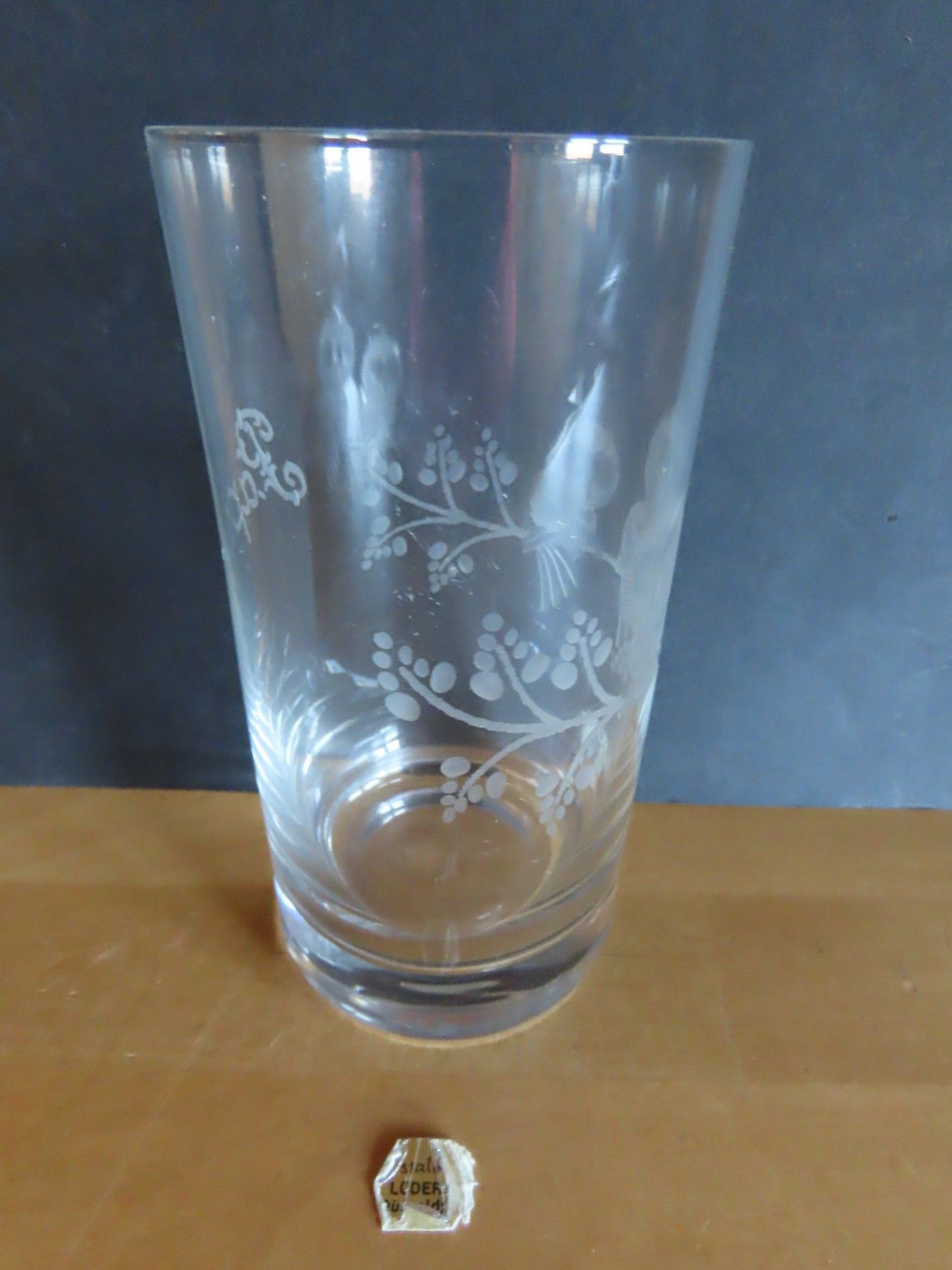 Maße: ca.13,2 cm hoch x ca. 6,7 cm am oberen Rand gemessen --der Boden Fuß hat einen Durchmesser von ca. 6 cm --immer die breiteste Stelle gemessen Material: Glas --Motiv ist graviert ist leicht verschmutzt... Mehr