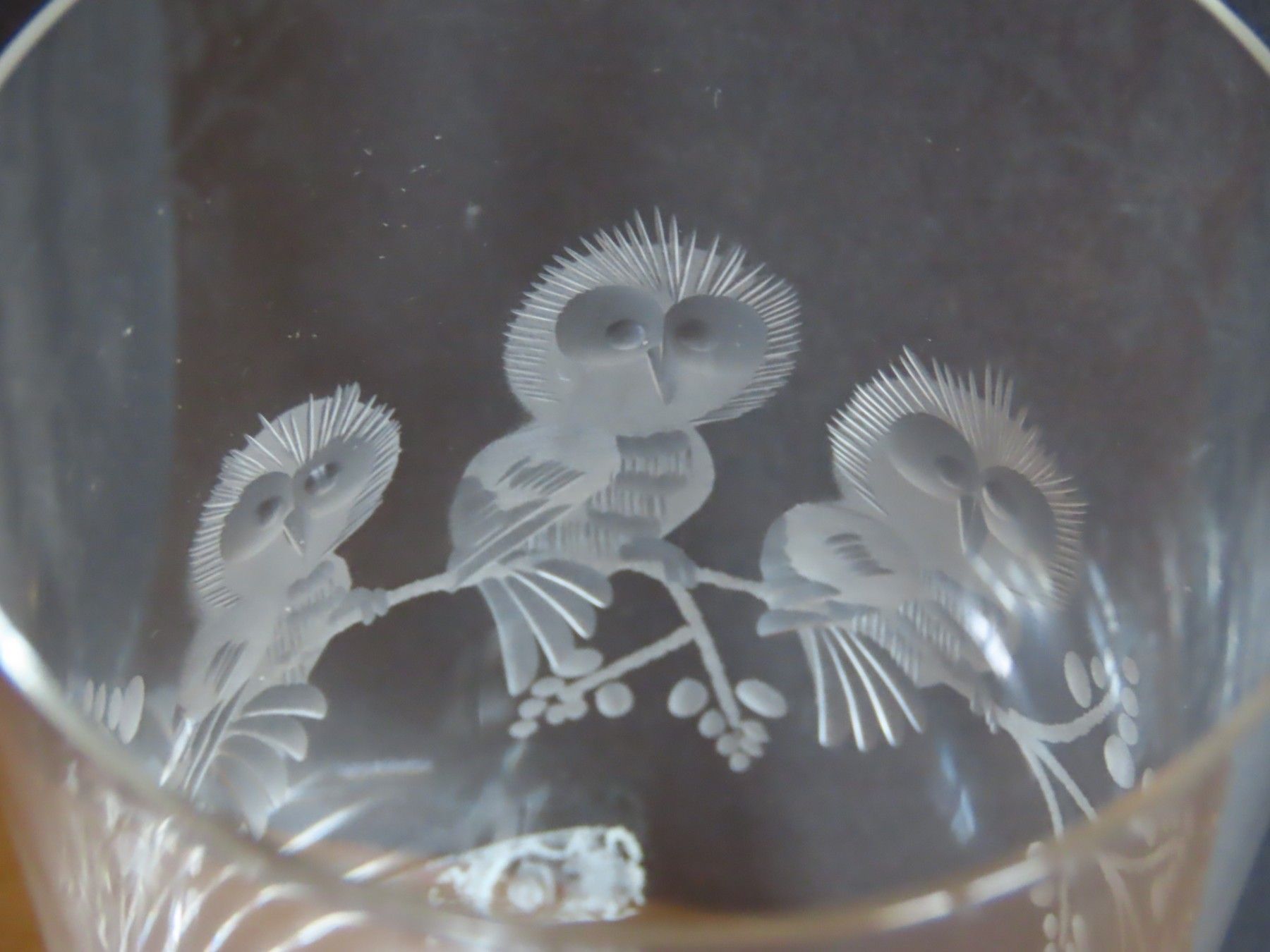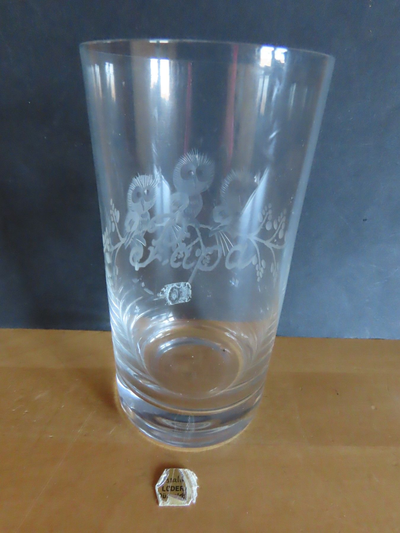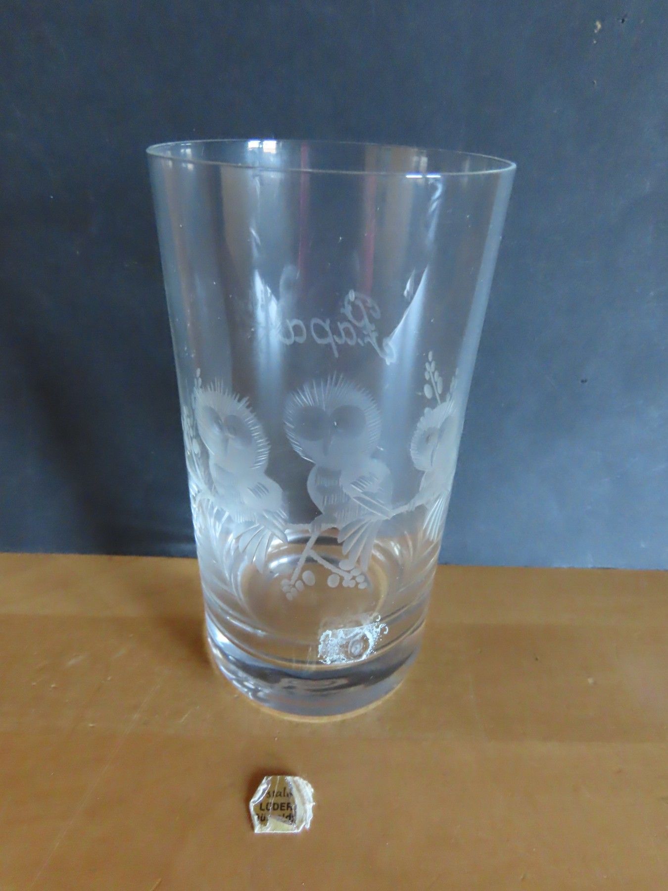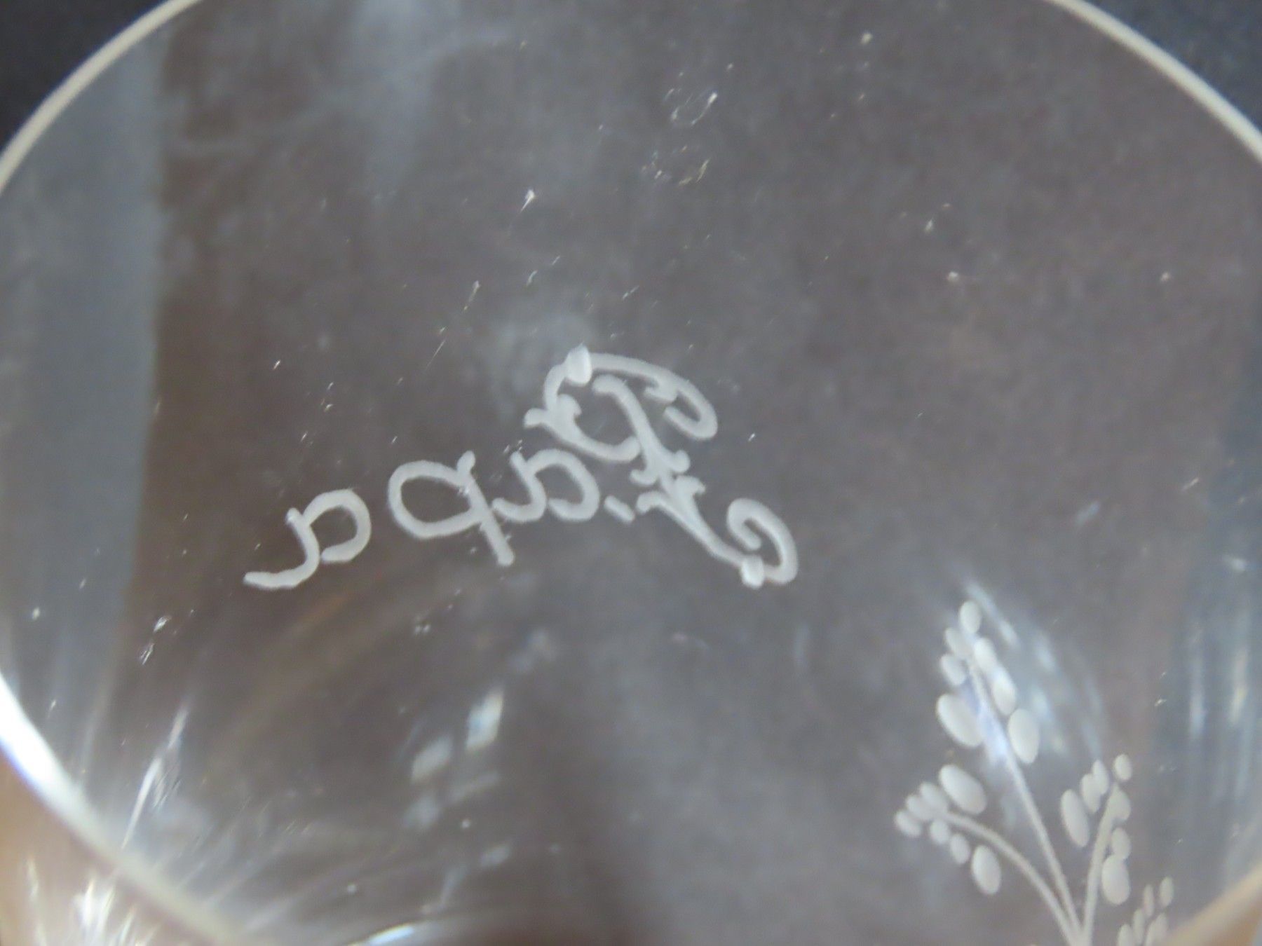 Maße: ca.13,2 cm hoch x ca. 6,7 cm am oberen Rand gemessen --der Boden Fuß hat einen Durchmesser von ca. 6 cm --immer die breiteste Stelle gemessen Material: Glas --Motiv ist graviert ist leicht verschmutzt... Mehr