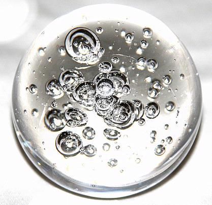 Glas Briefbeschwerer glasklar mit Perlen innen aus den 1980er Jahren Der Briefbeschwerer hat eine Höhe von zirka 6 cm, der Durchmesser der Standfläche beträgt 3,3 cm. Der Umfang beträgt 20,5 cm. Auf der Unterseite befindet sich ein Etikett mit dem Schriftzug Saphira. Der Briefbeschwerer ist neuwerti