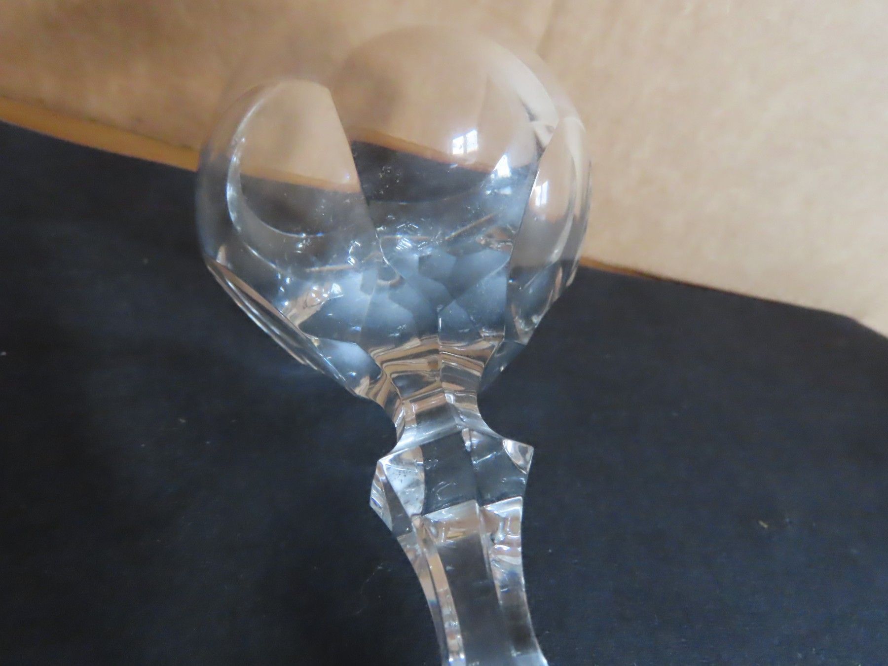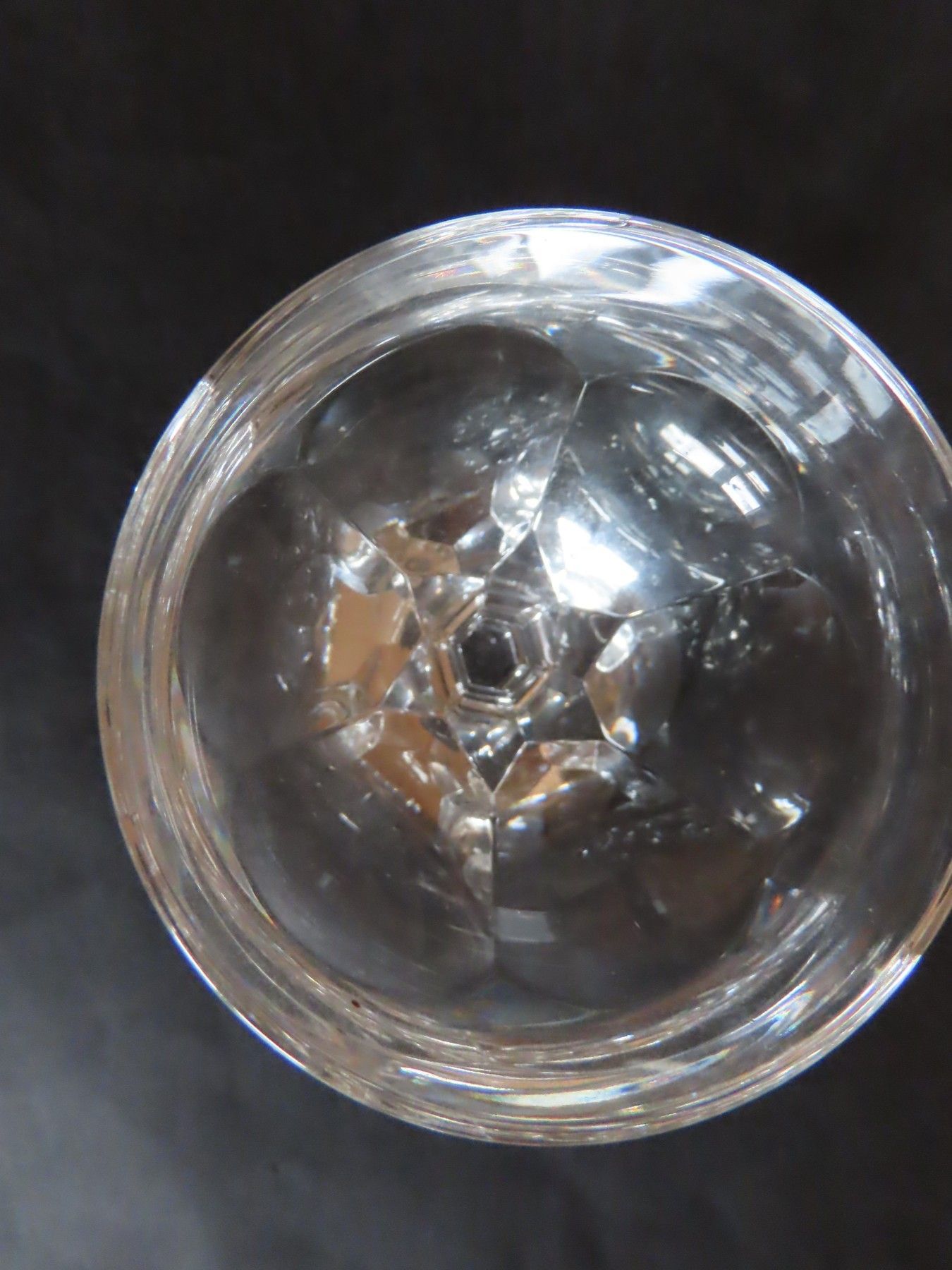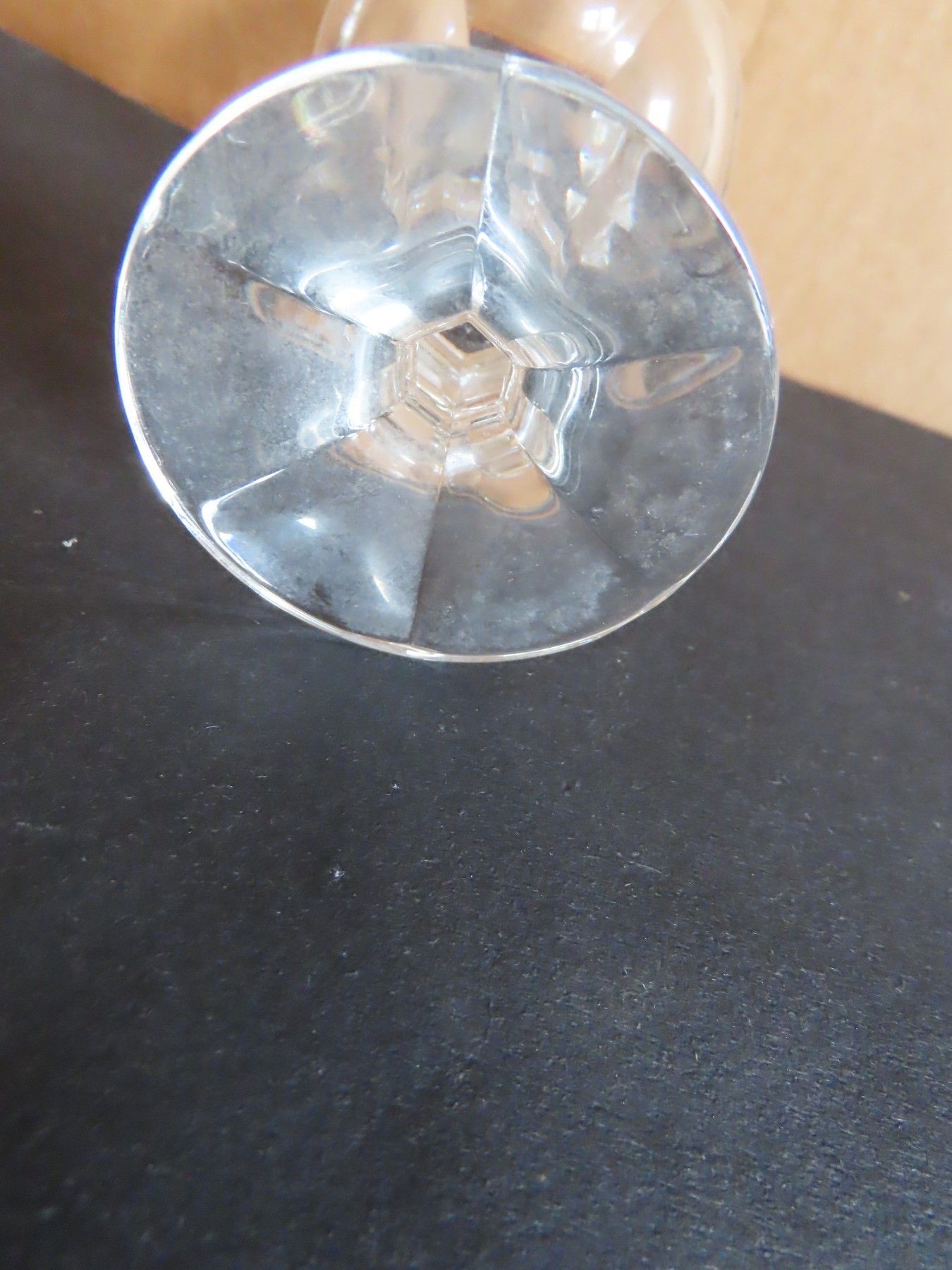 Maße: ca.10,3 cm hoch x ca. 6,3 cm Durchmesser, Fuß hat einen Durchmesser von ca. 5 cm--immer die breiteste Stelle gemessen Öffnung hat einen Durchmesser von ca. 6,2 cm Material: Glas ist leicht verschmutzt und hat feine Kratzer... Mehr