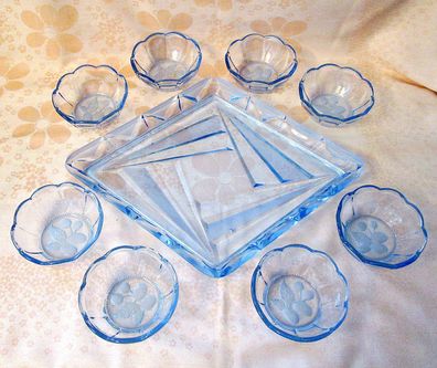 • Vintage * Omas Geschirr * Anbieteteller & 8 Dessertschalen blaues Glas