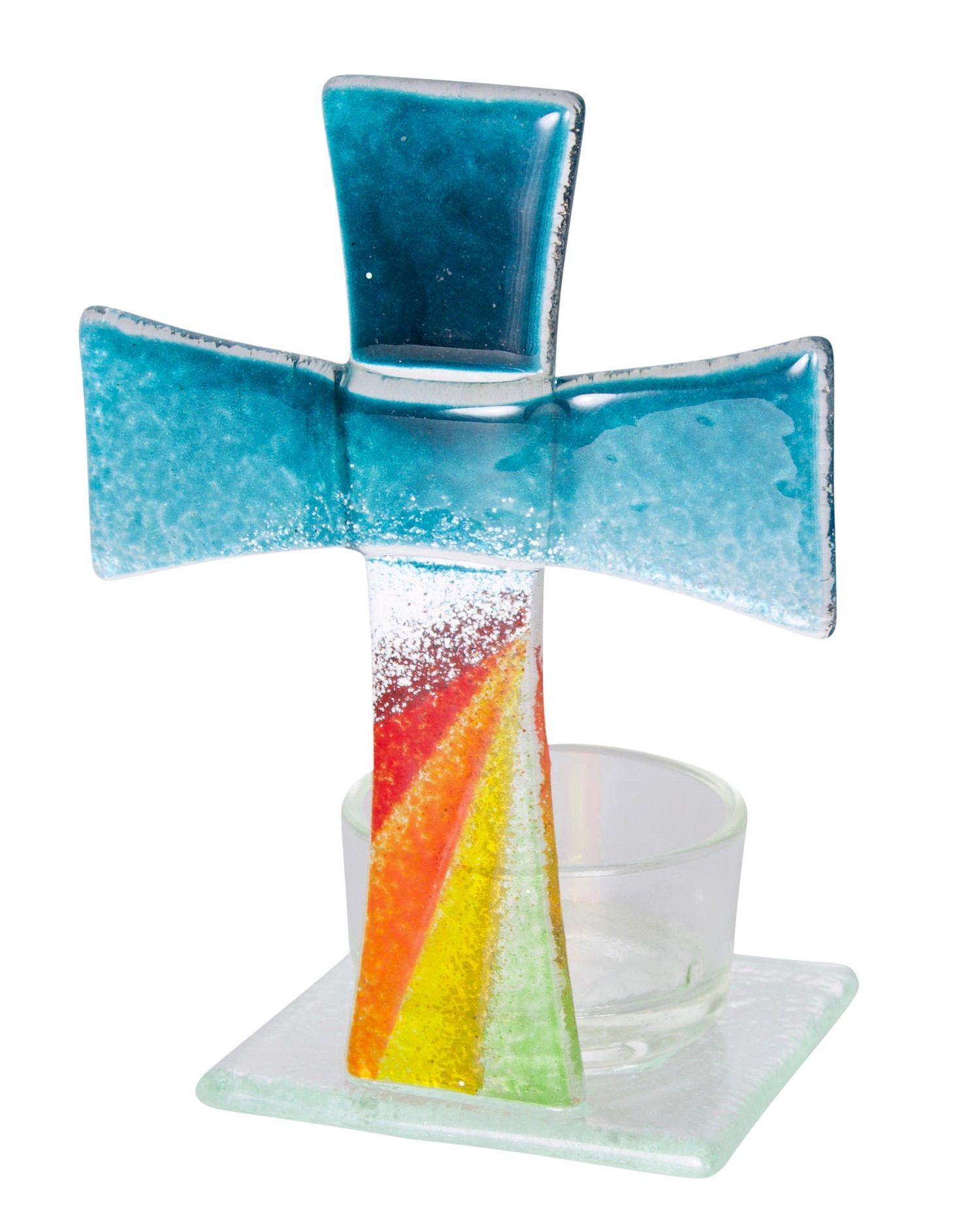 Glas-Teelicht Kreuz, Stehkreuz Regenbogen-türkis