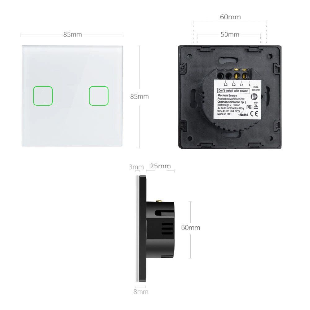 Glas Touch Lichtschalter Wandschalter Anzeigelicht 2-fach Schalter Weiß Eckig
