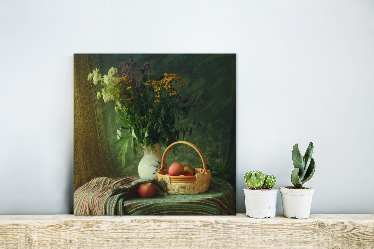 Glasbilder - 20x20 cm - Stilleben - Blumen - Apfel - Korb - Tisch - Malerei