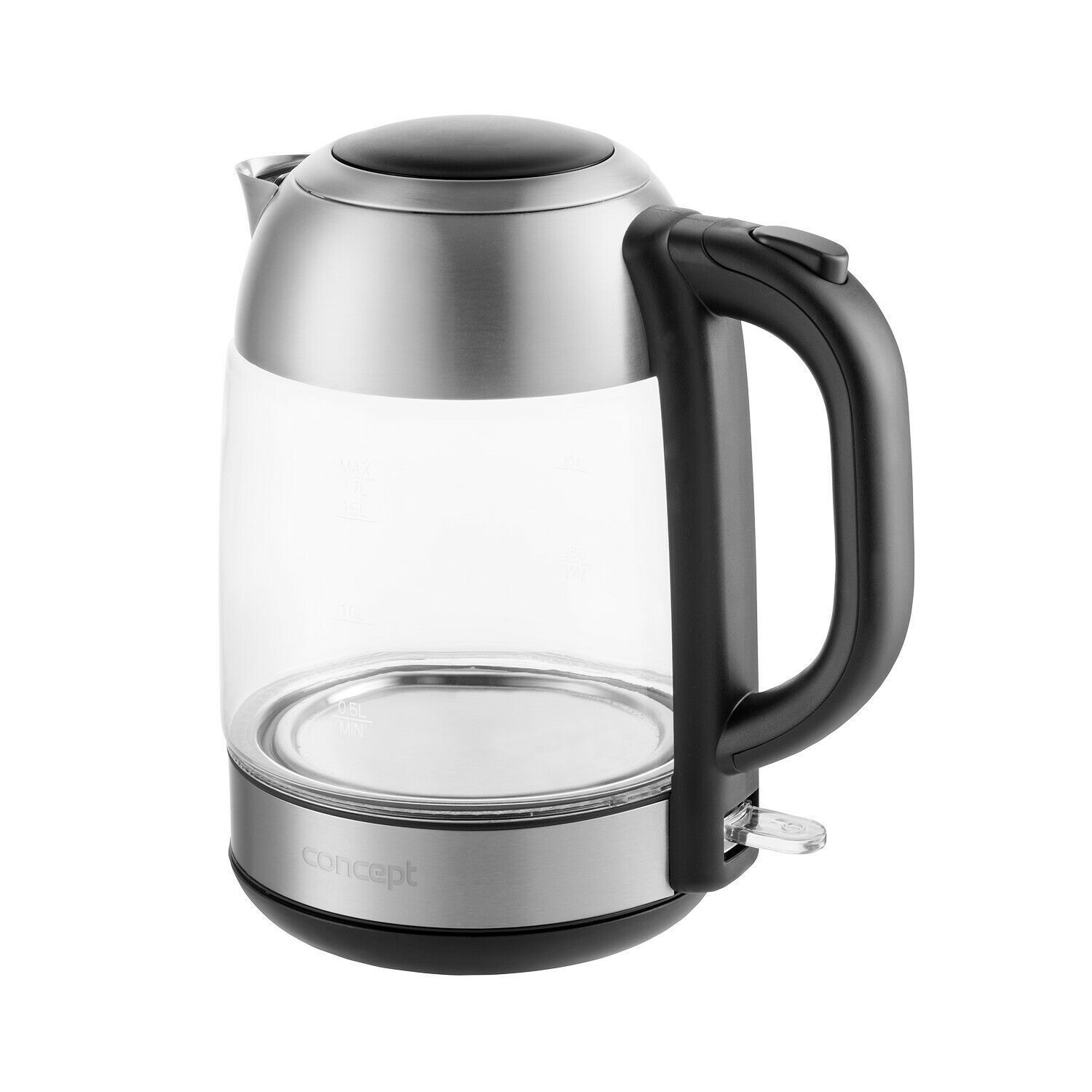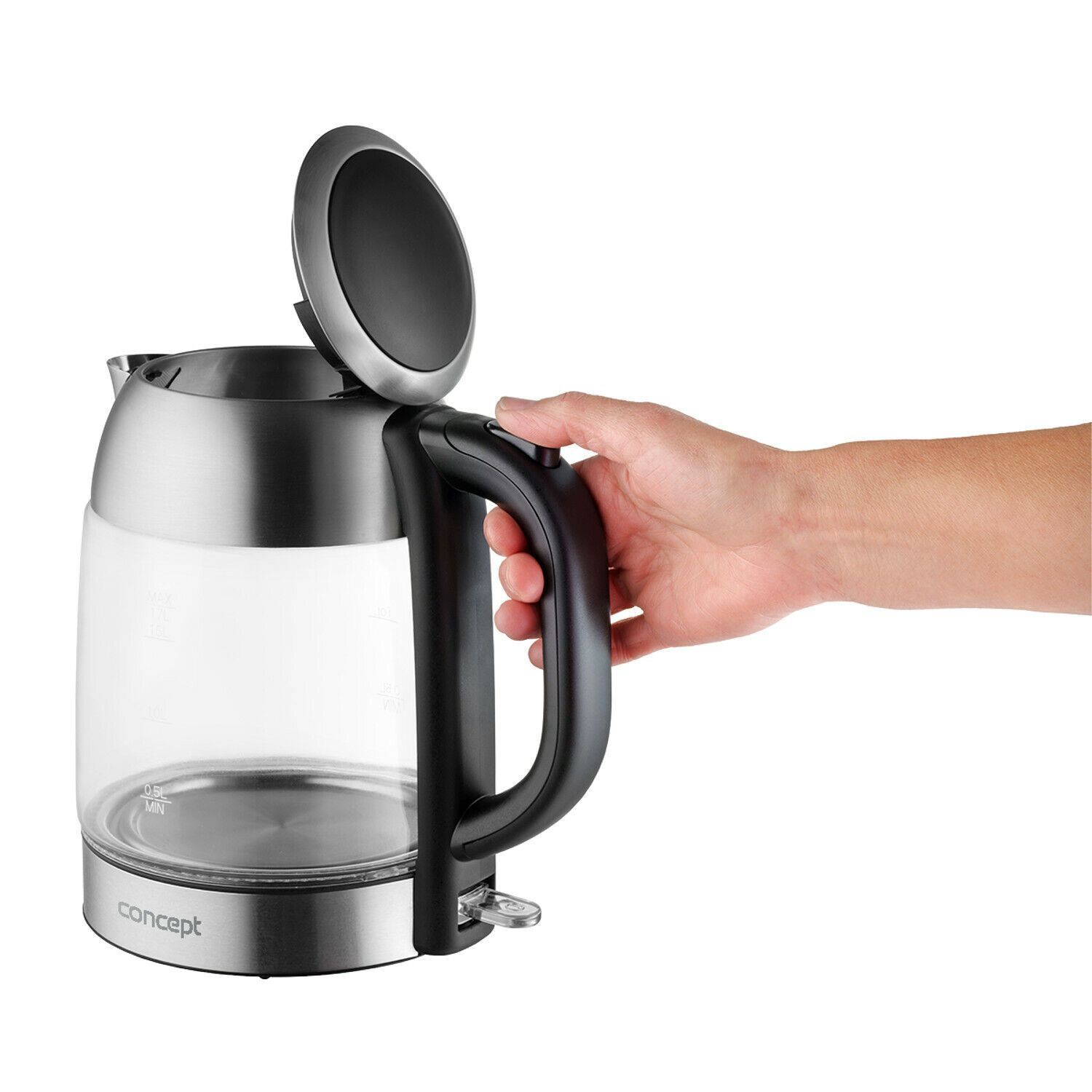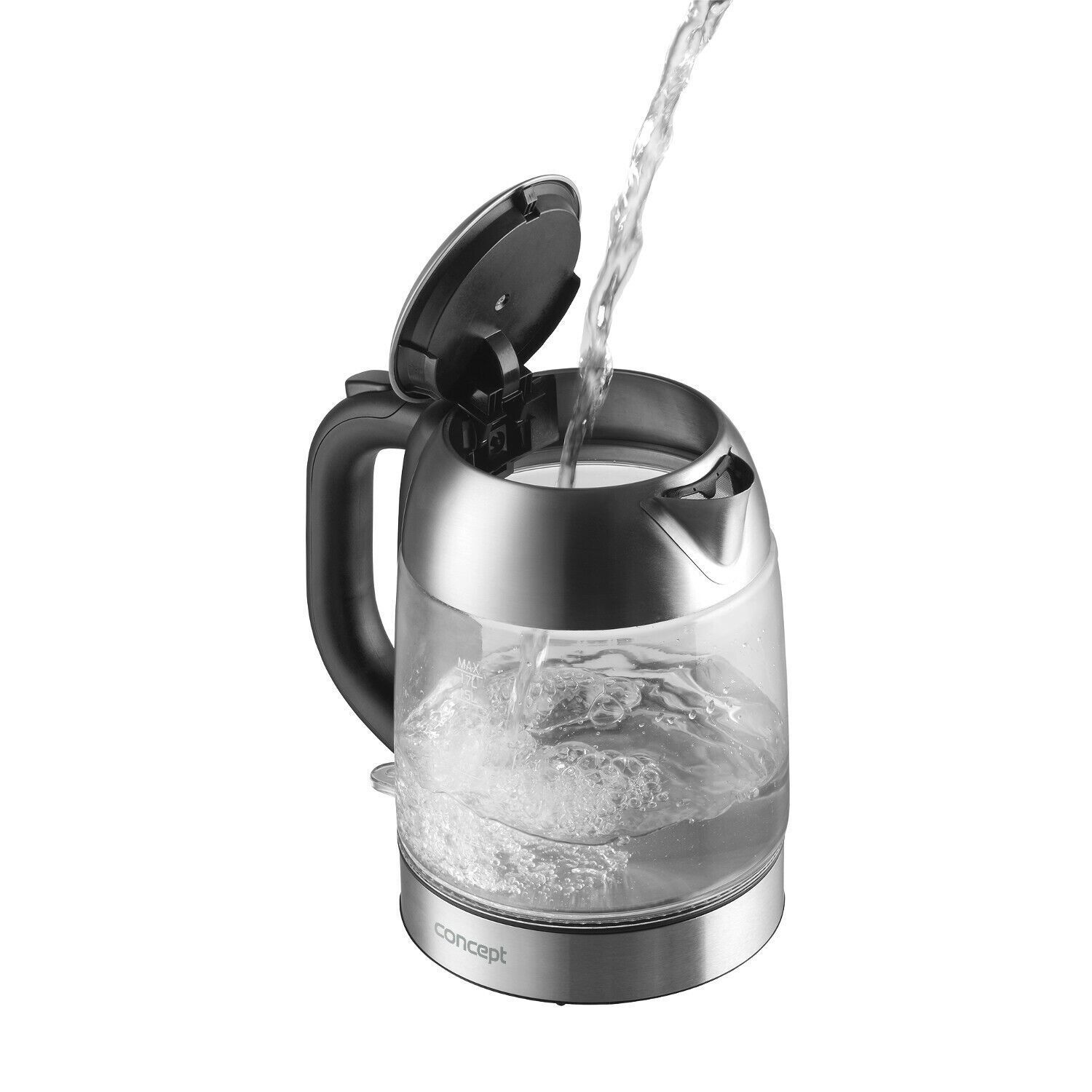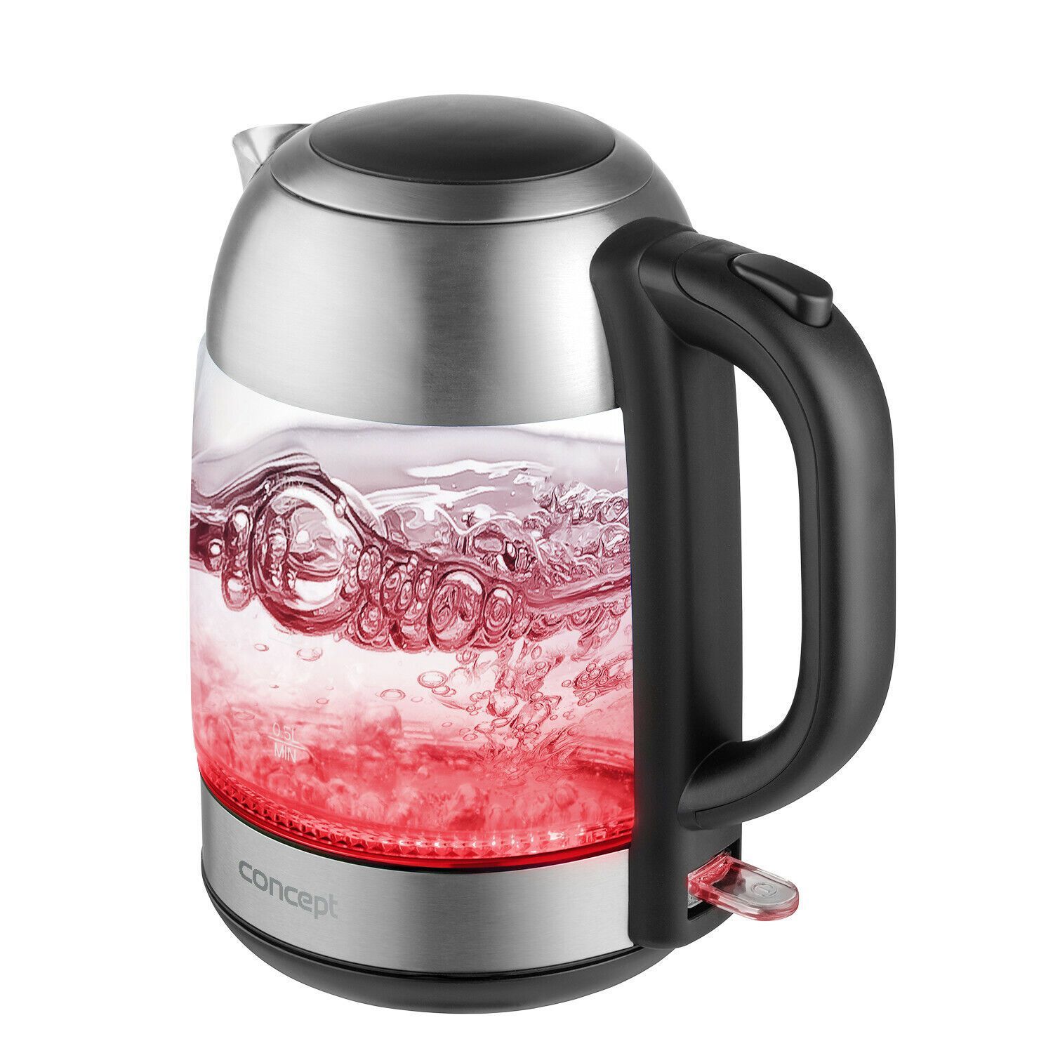 Glas Wasserkocher Concept Edelstahl 1,7 Liter Artikelnummer:66794,66795 - Anzeige für klare Wasserverteilung - LEDs, die während des Betriebs rot leuchten - Hergestellt aus hochwertigem gehärtetem und ungiftigem Borosilikatglas - Beständig gegen hohe Temperaturen und Verfärbungen - Drehbasis - Dreif