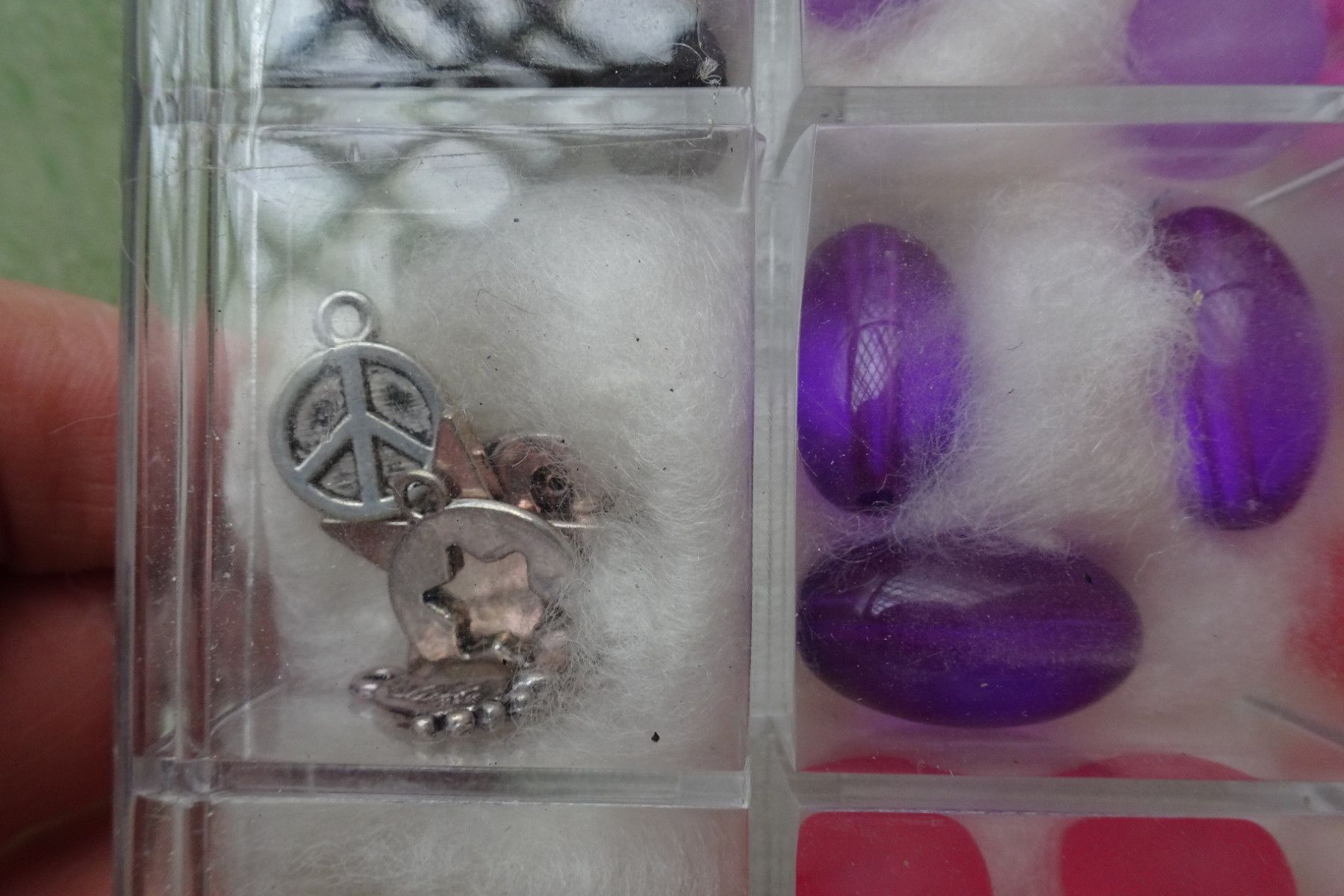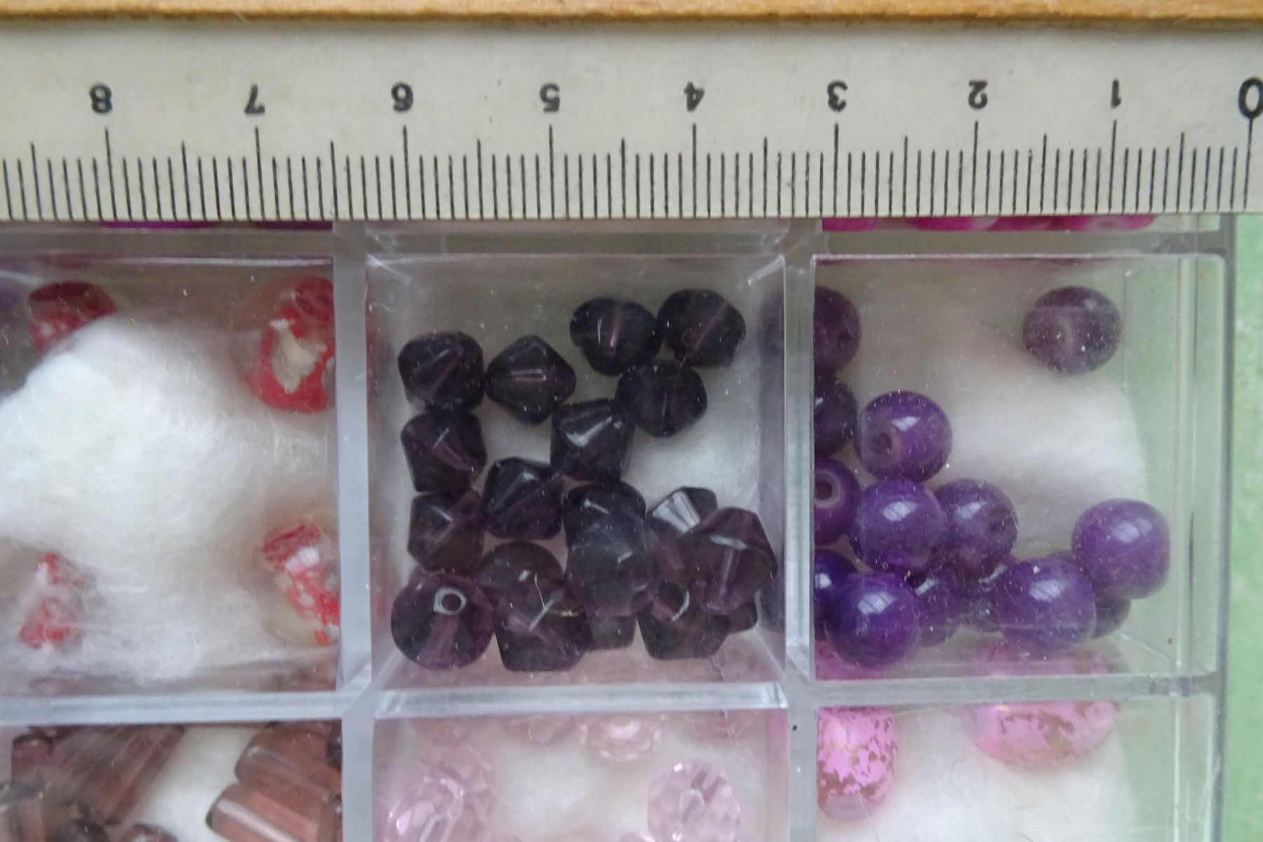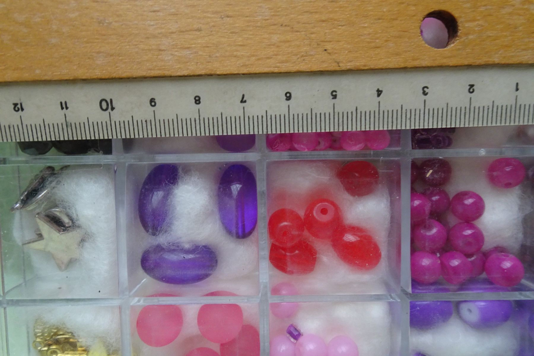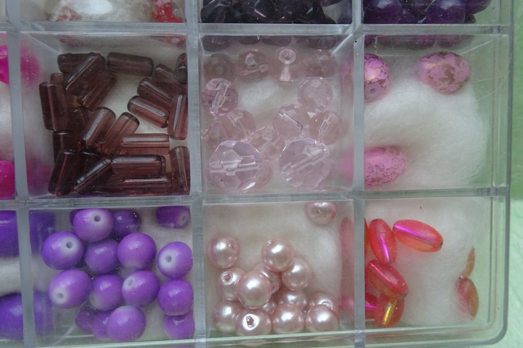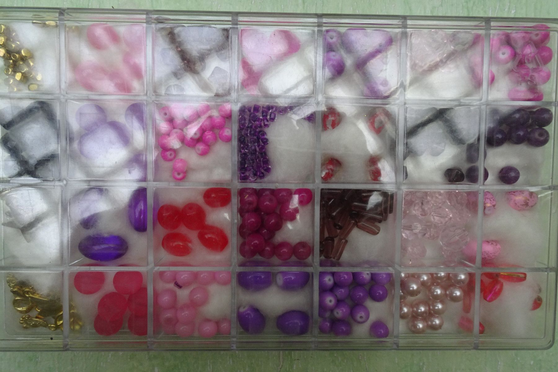 Glasperlenmix rosa-rot-lila & Charms gold silber Sortierbox