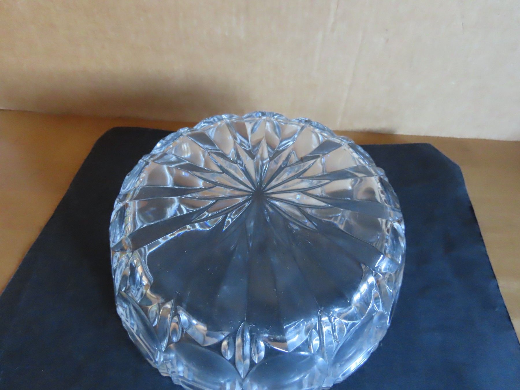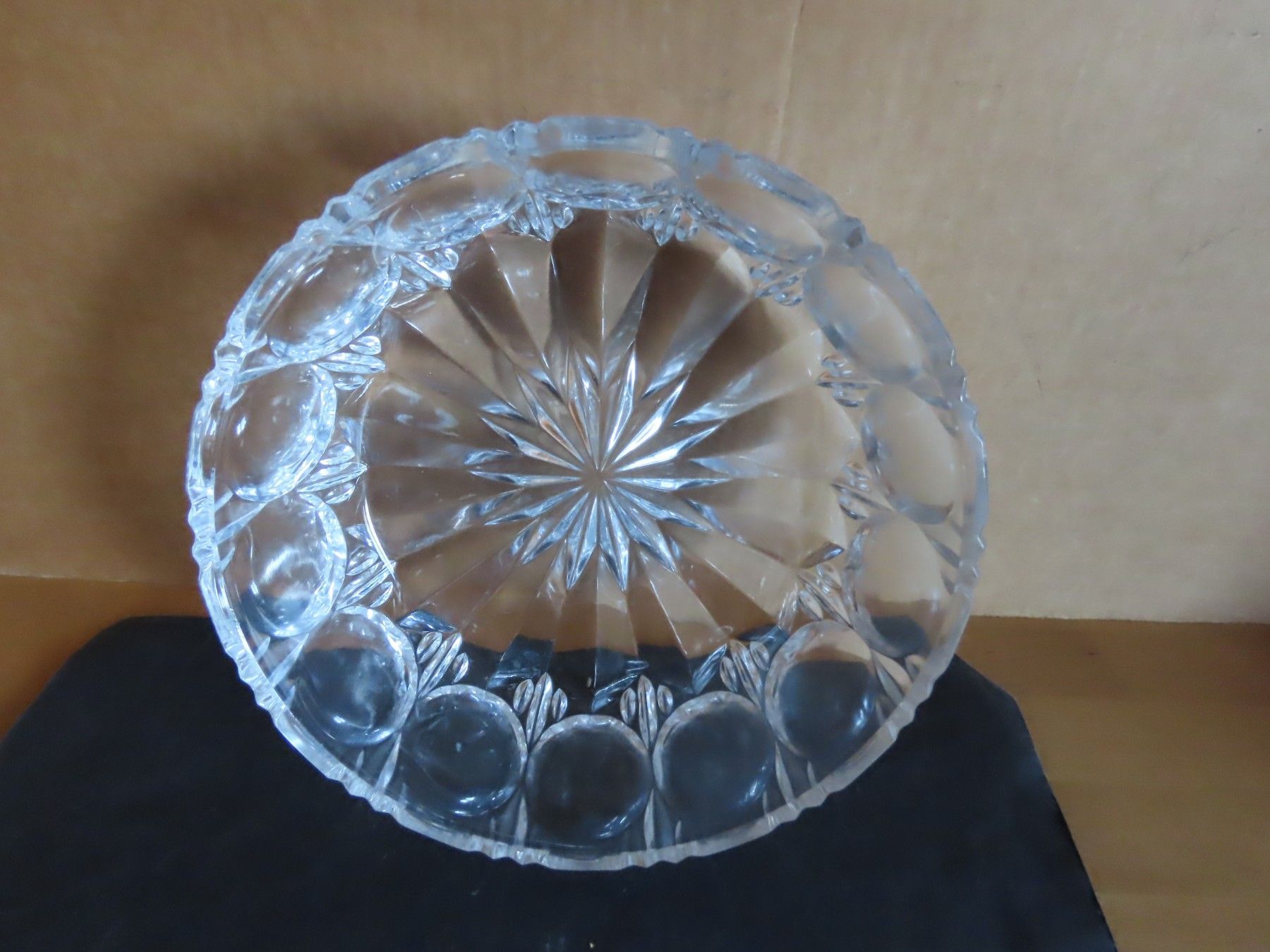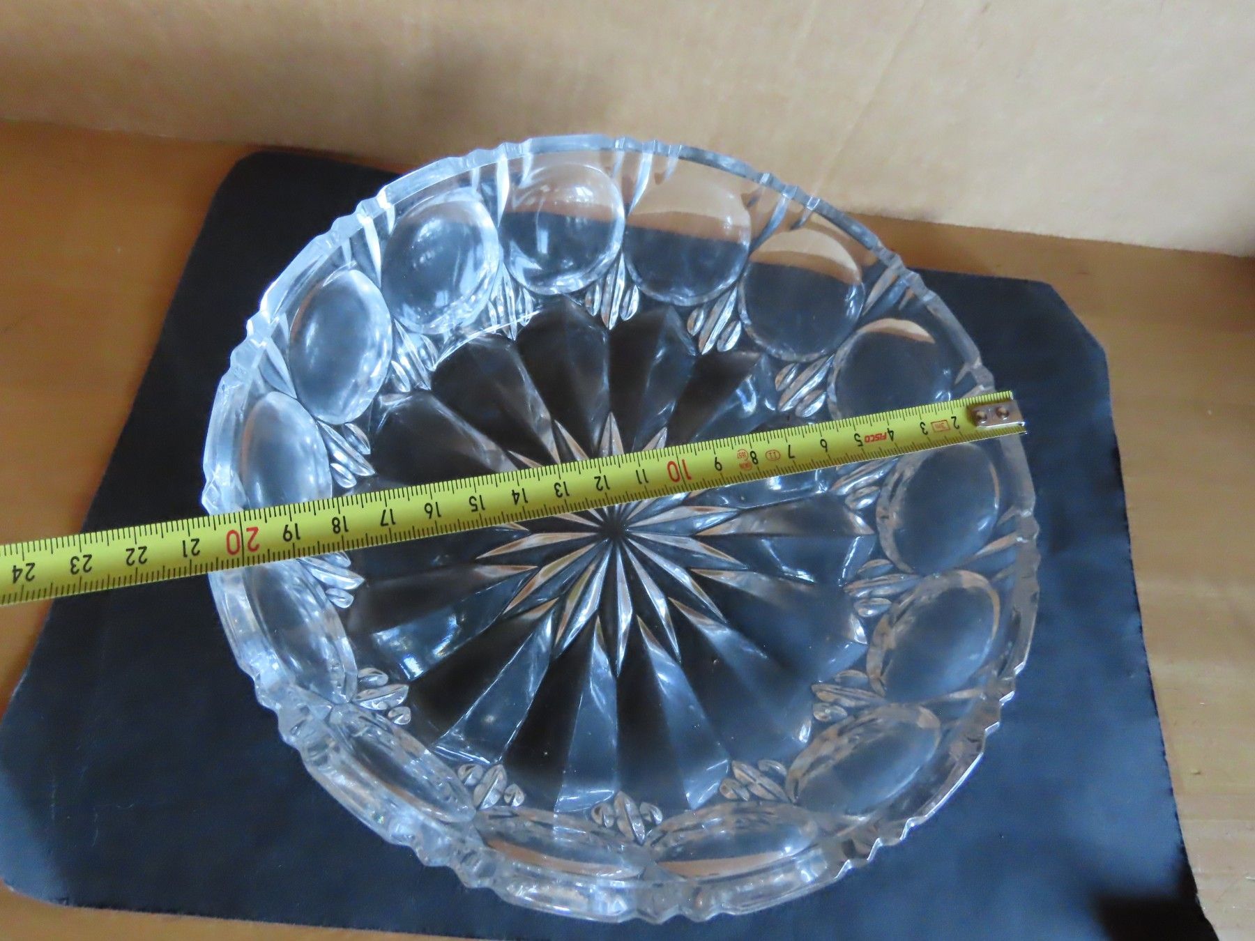 Maße: ca. 7,5 cm hoch und hat einen Durchmesser von ca. 21 cm ----immer die breiteste Stelle gemessen der Boden hat einen Durchmesser von ca. 16,5 cm Material: Glas ist leicht verschmutzt verstaubt,hat feine Kratzer, am oberen Rand eine winzige Absplitterung