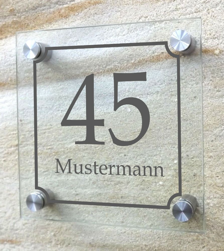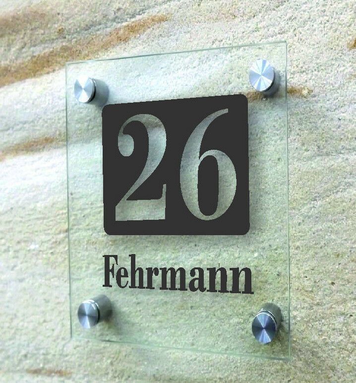 Edelstahl-Glasschild individuell Beschriftbar 15 x 15 cm Edles Glasschild mit Edelstahlbefestigungen beschriftet nach Ihren Angaben! Absolute UV- und Witterungsbeständigkeit. Material Halter: Edelstahl, Wandabstand 15mm Glas: temperiertes Sicherheitsglas, 150x150x4mm Beschriftung mit geplotteter Hoc
