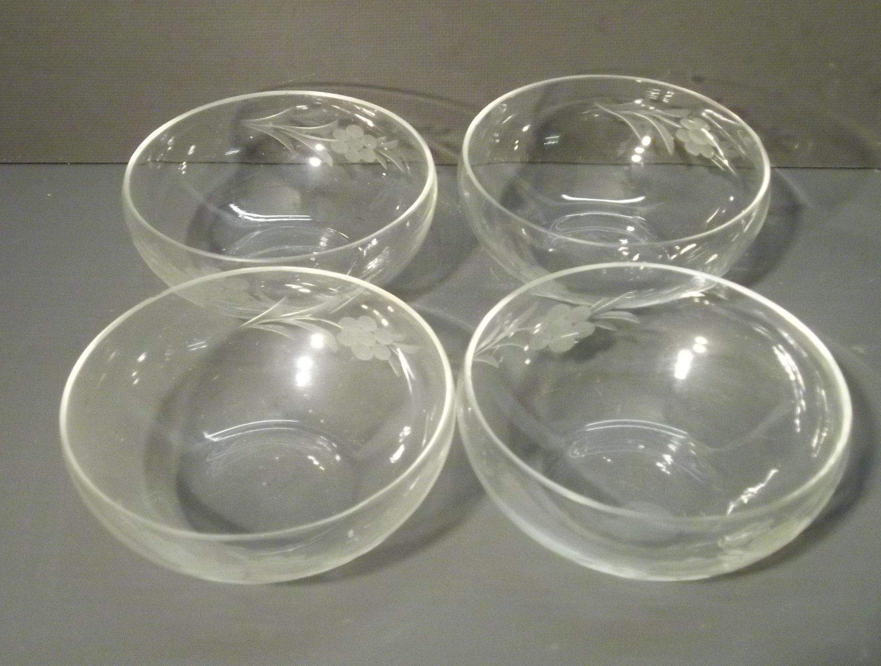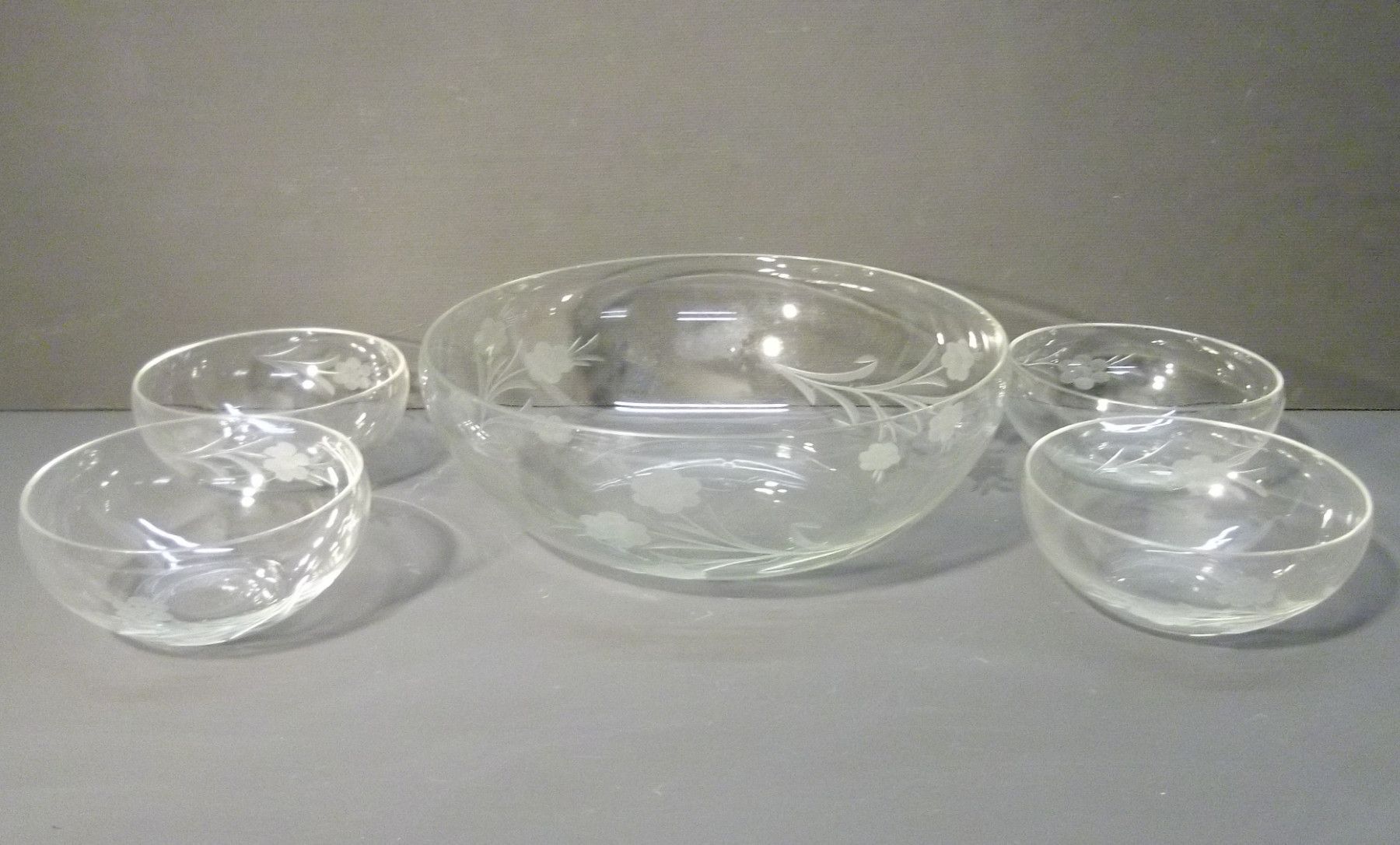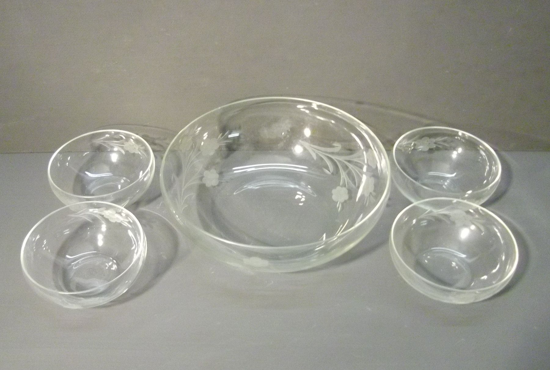 Kompott-Service um 1930. Eine große und vier kleine Schalen. Kleiner Abplatzer an der großen Schale. Maße: Ø 21 bzw. 10,5 cm. Antikes am Deich - Inh: Oliver Kipp-Trense