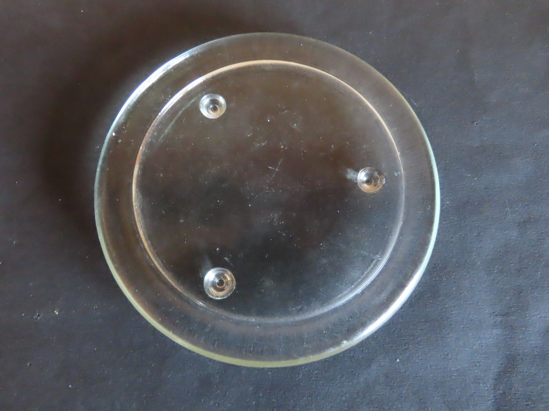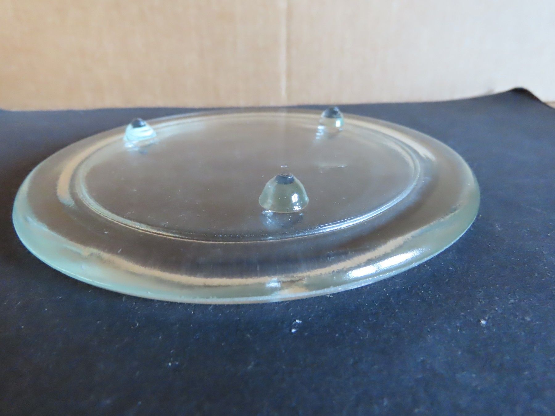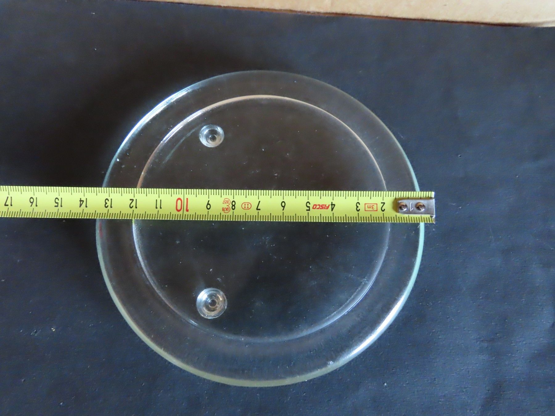 Maße : ca. 13,5 cm Durchschitt , ca. 1,5 hoch ----immer an der breitesten Stelle gemessen Standfußfläche für die Kerze hat einen Durchmesser von ca. 10,3 cm Material: Glas ist verschmutzt verstaubt, hat Kratzer, Verarbeitungsfehler