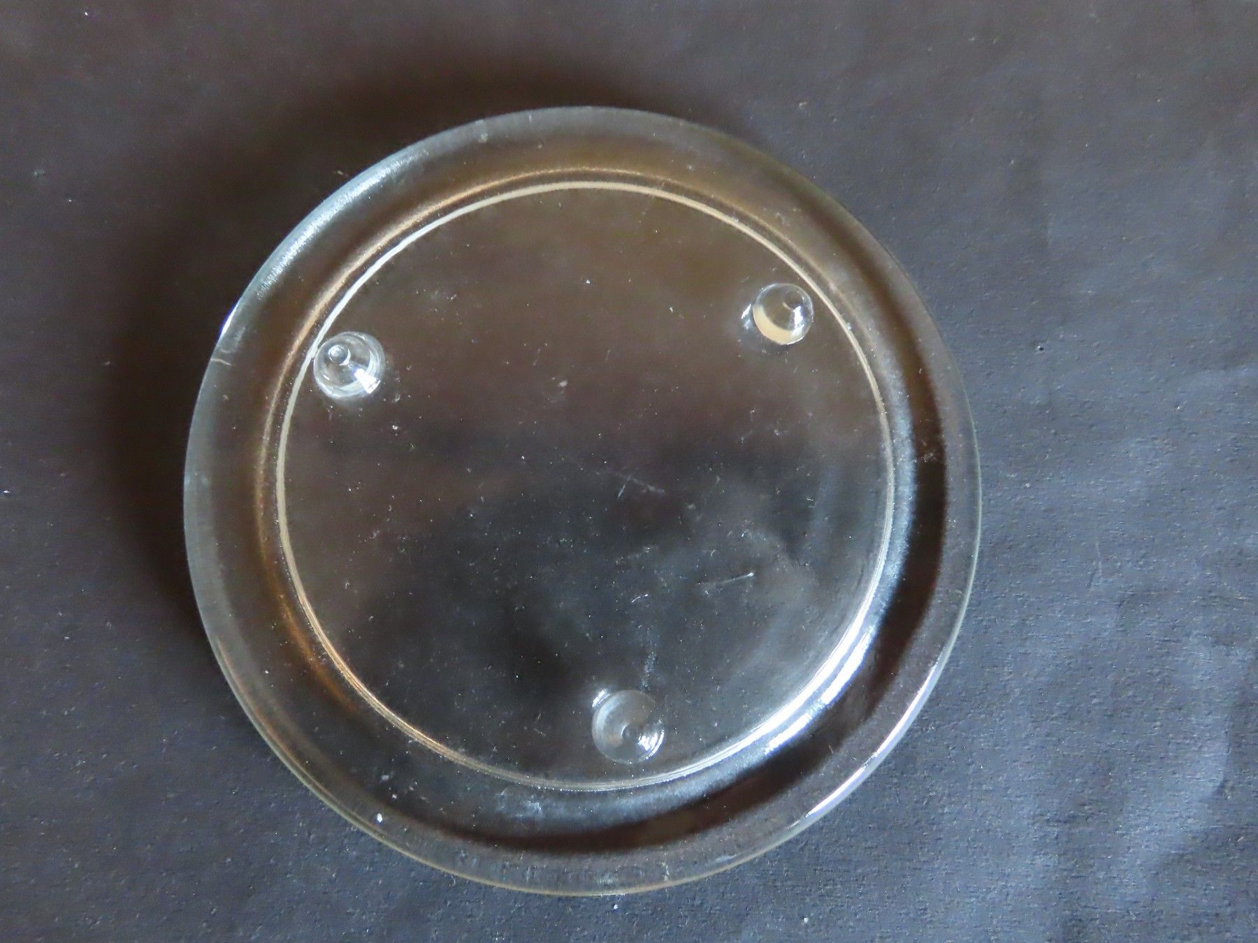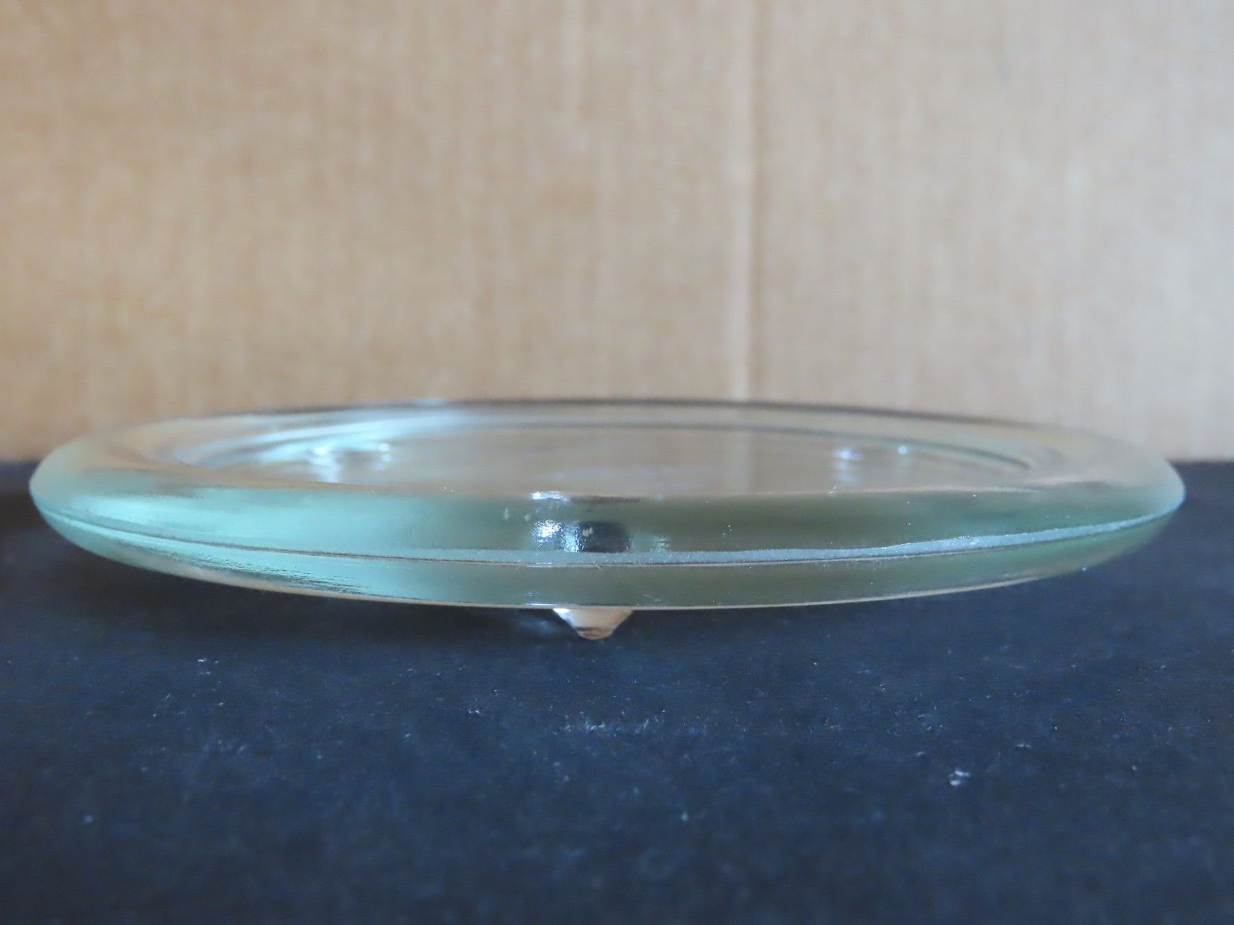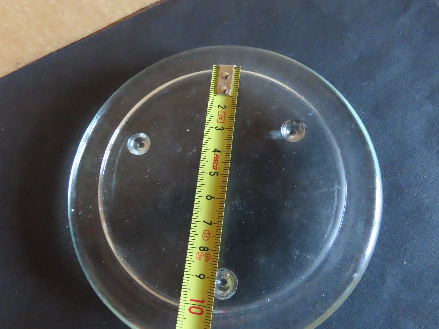 Maße : ca. 13,5 cm Durchschitt , ca. 1,5 hoch ----immer an der breitesten Stelle gemessen Standfußfläche für die Kerze hat einen Durchmesser von ca. 10,3 cm Material: Glas ist verschmutzt verstaubt, hat Kratzer, Verarbeitungsfehler