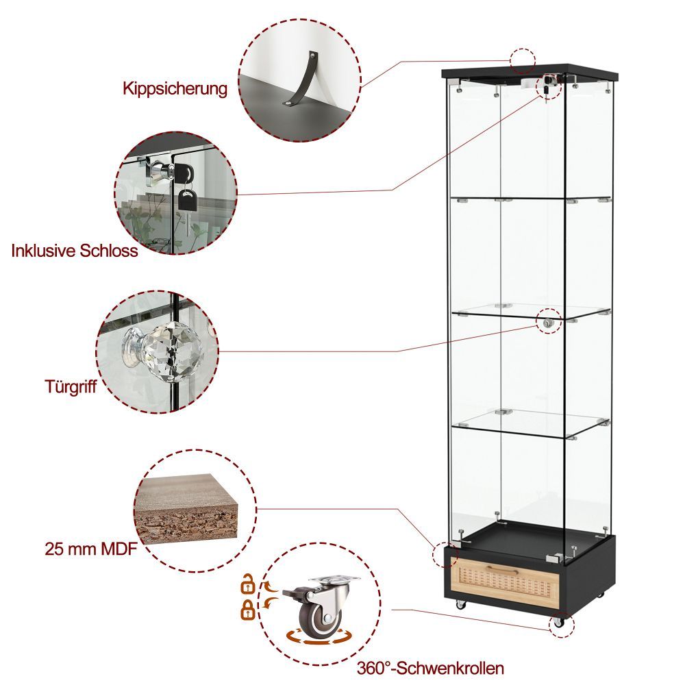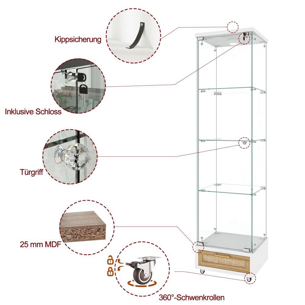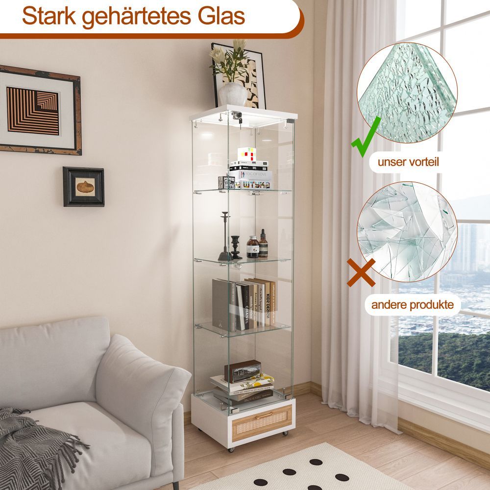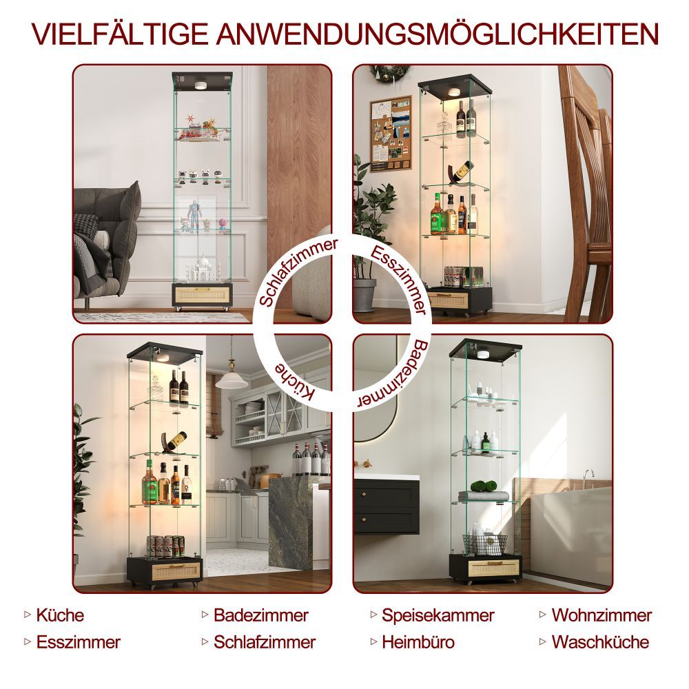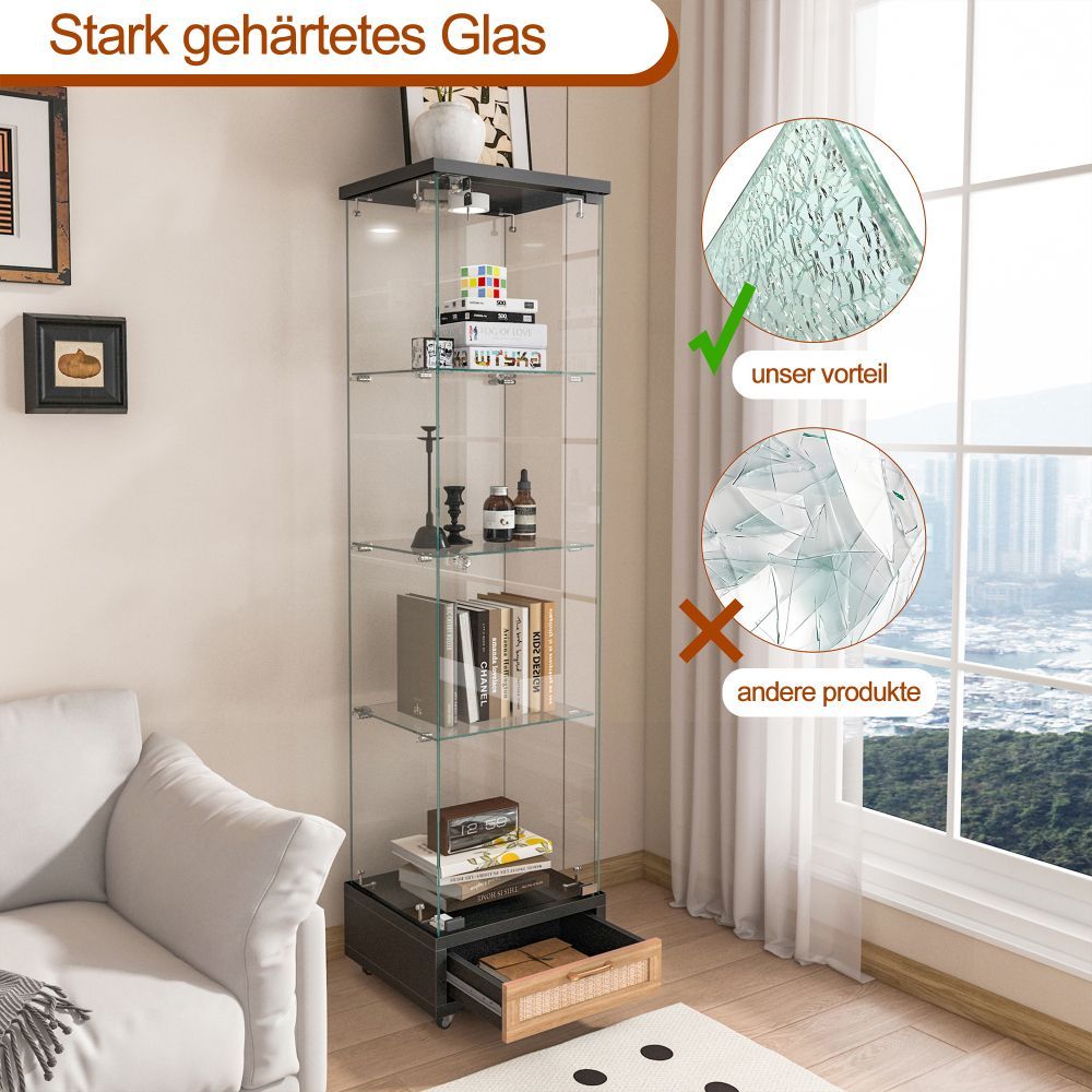 Glasvitrine mit LED, Schubladen, Bücherregal, Schrank, 4 Böden