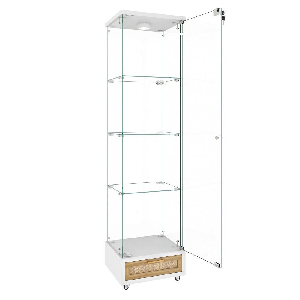 Moderne Glasvitrine mit Schubladen und LED-Beleuchtung. Gefertigt aus MDF und gehärtetem Glas, mit einer Tür und vier Einlegeböden. Ideal zur Aufbewahrung und Präsentation von Büchern, Dekoration oder Alltagsgegenständen im Wohn- oder Schlafzimmer.