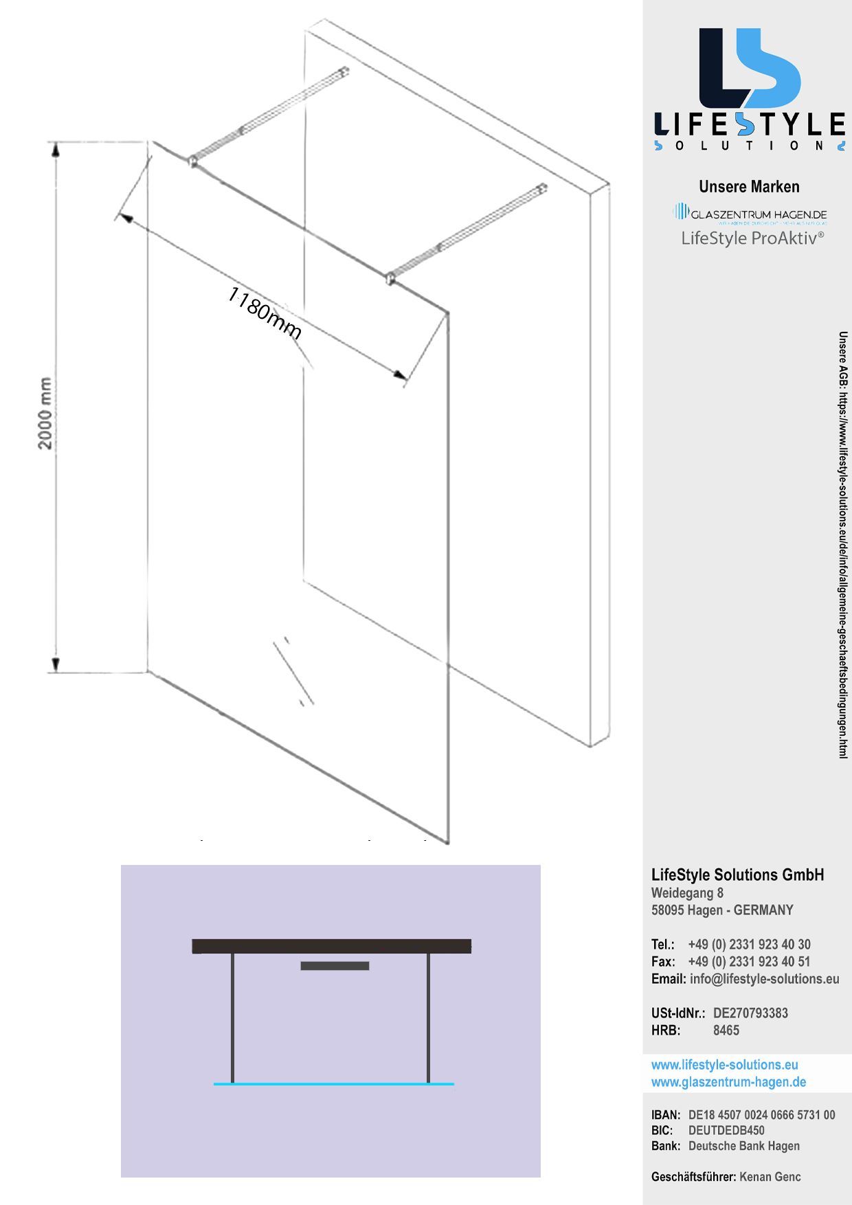 Glaszentrum Hagen Eva 118x200 cm 10mm Duschwand Satin-M