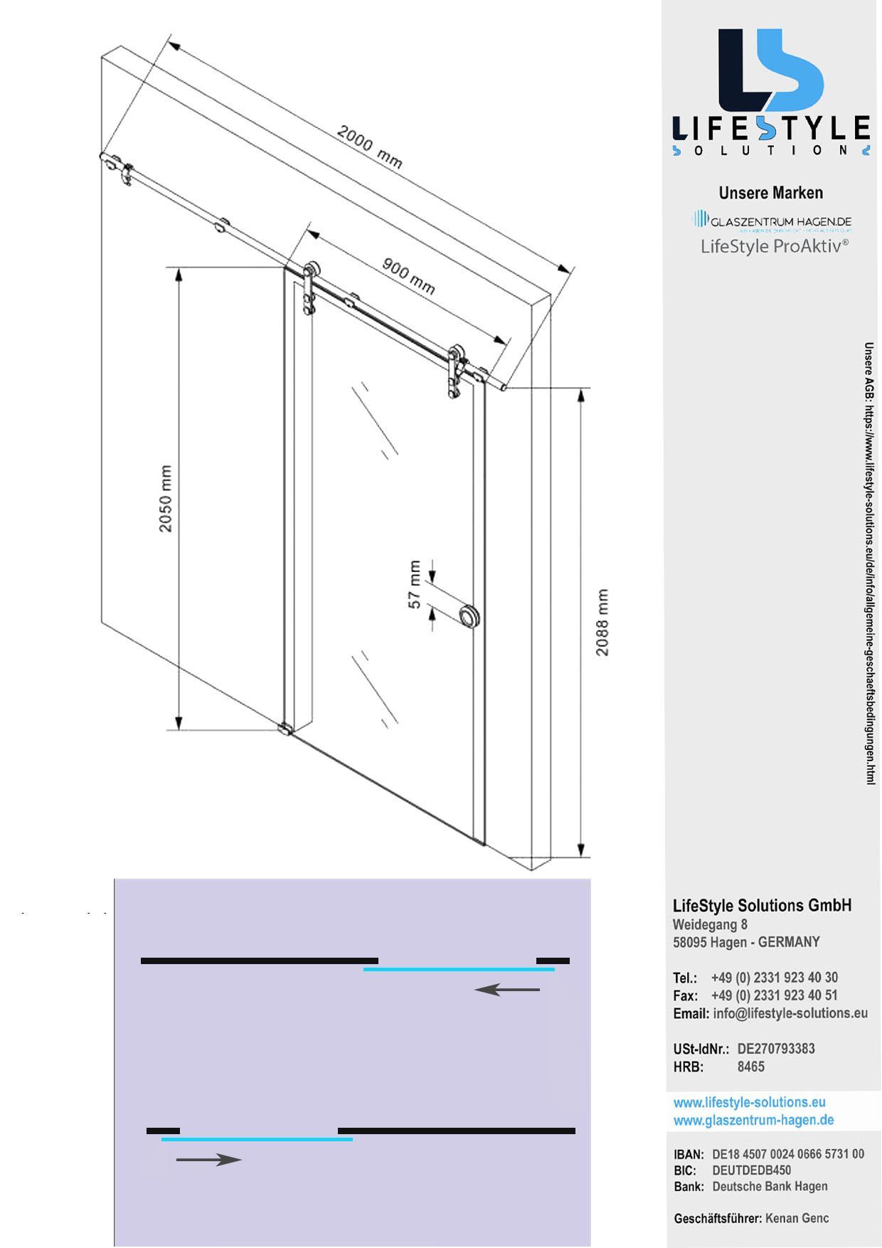 Glaszentrum Hagen Glasschiebetür 2050x900x8 mm Ouer, ESG