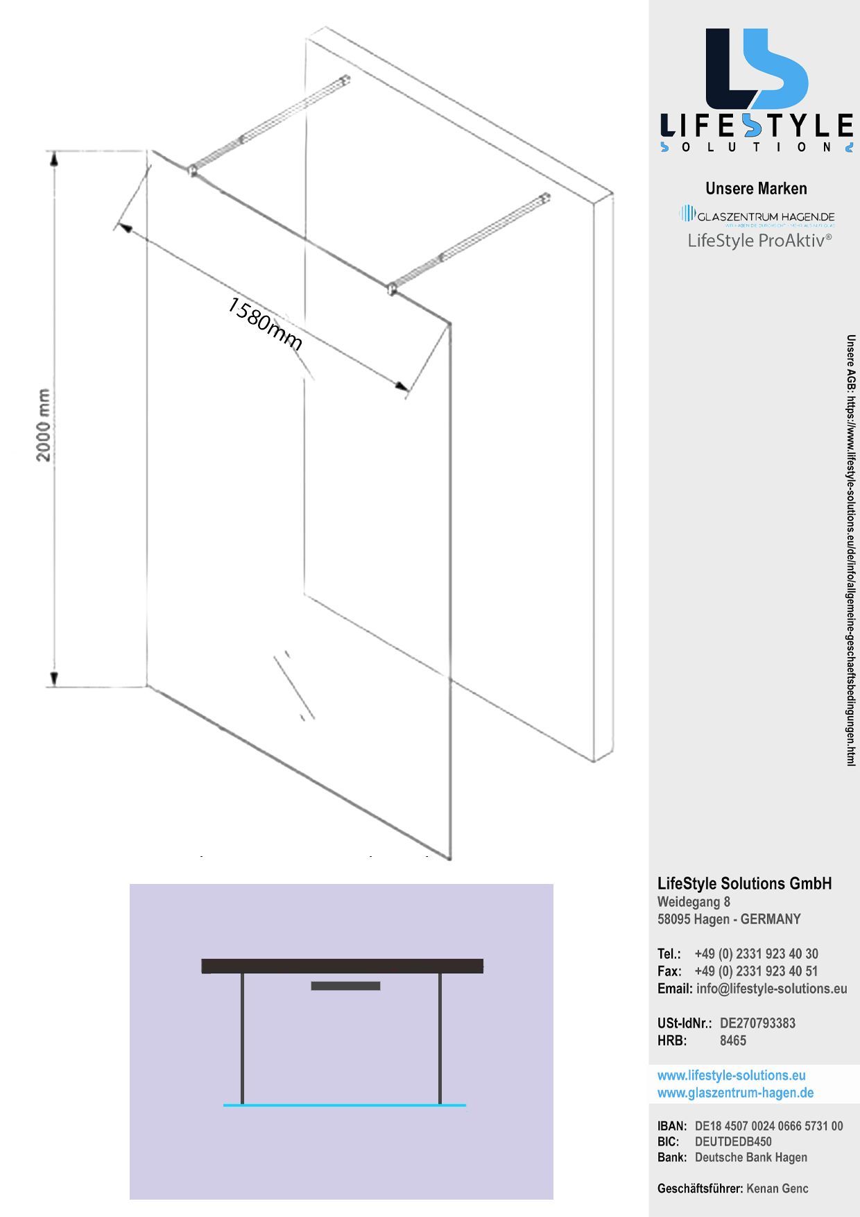 Glaszentrum Hagen - "Jade" 158x200cm 10mm Freistehende Walk in Duschwand - Duschab