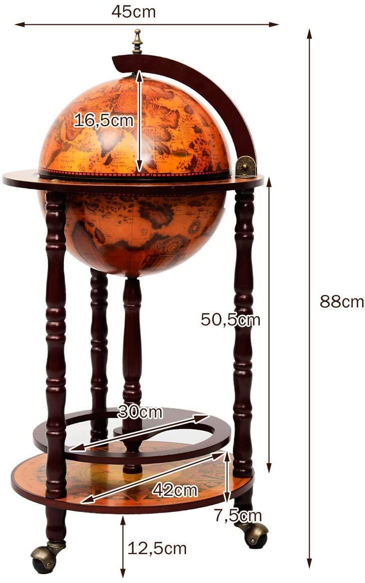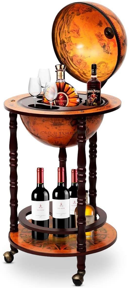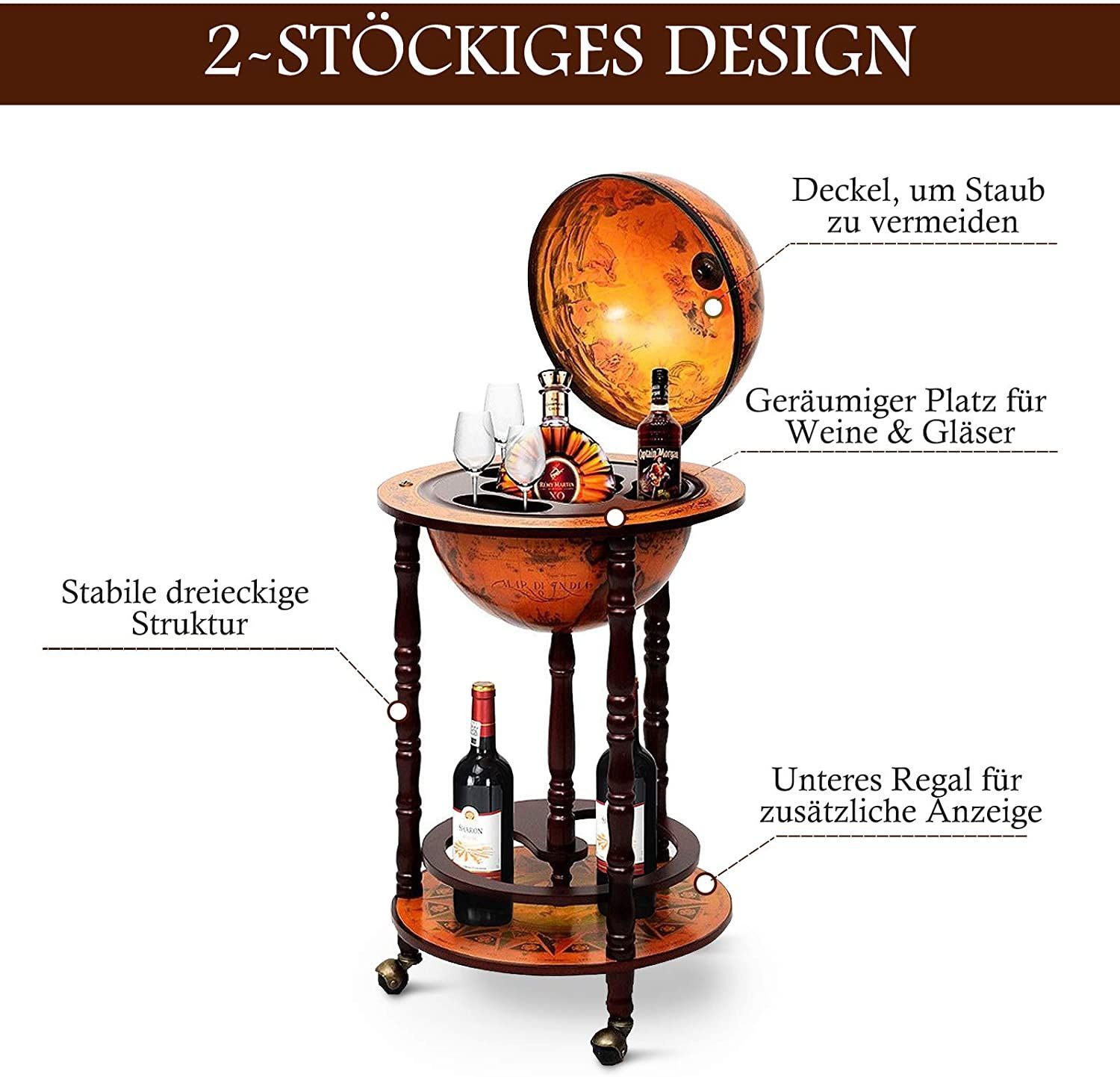 Globusbar Weinregal, 2-Stöckiges Barwagen mit 3 Rollen, Vintage Servierwagen (Braun)