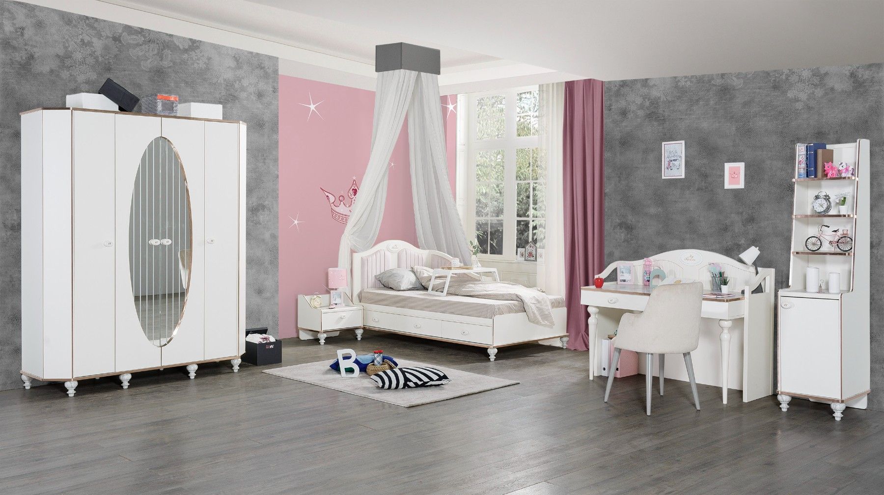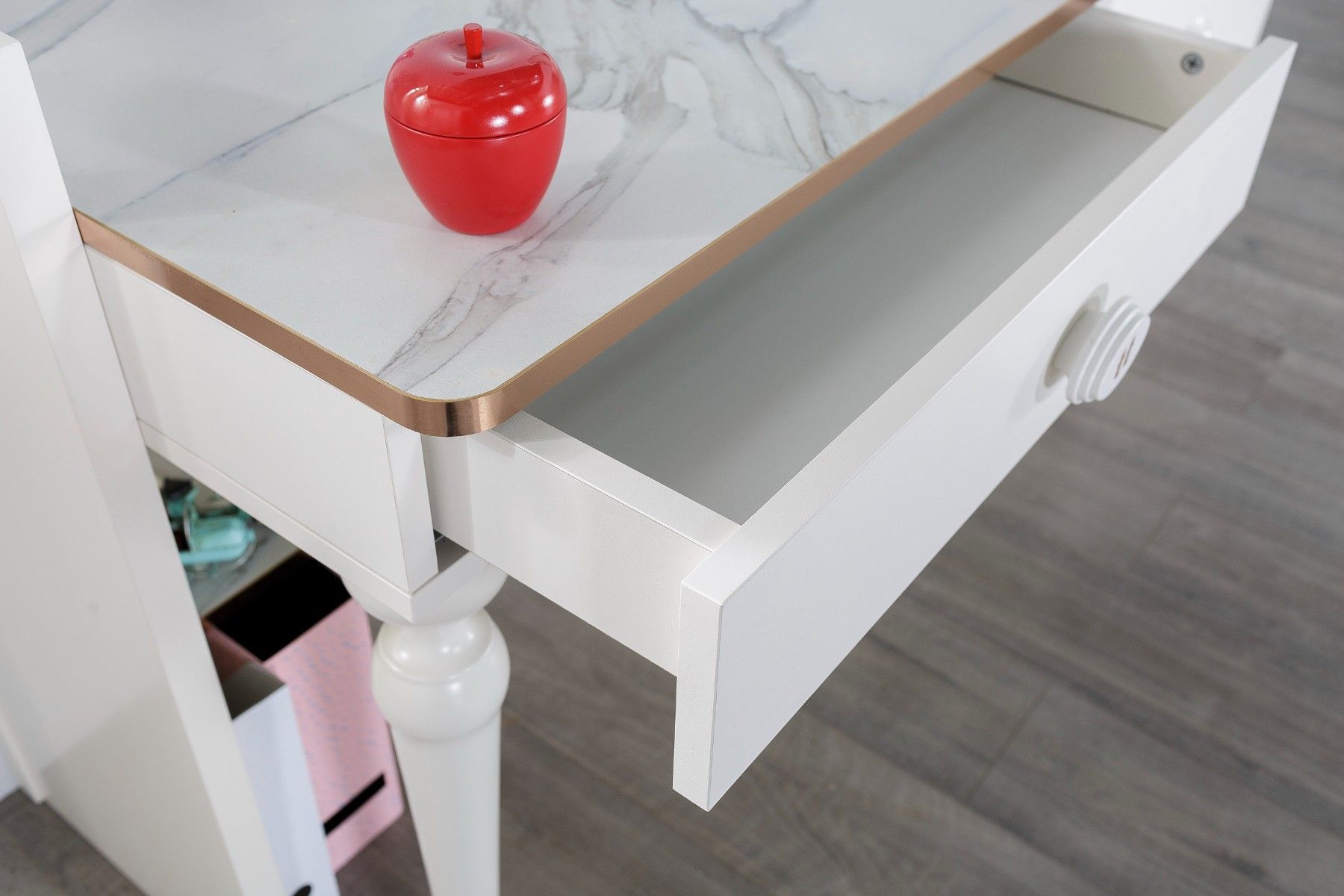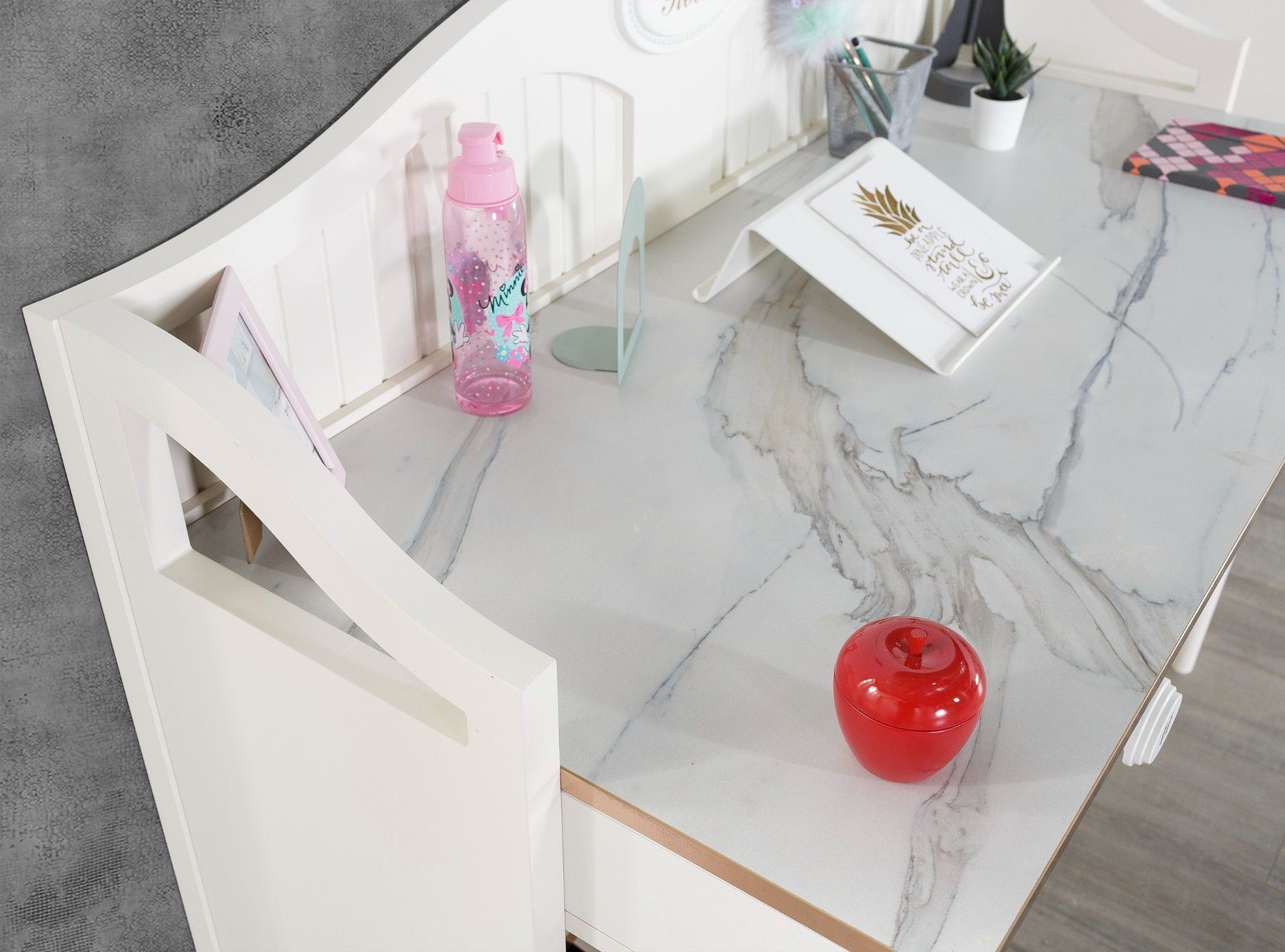 Aus dem Kinder Schlafzimmer Set Gloria 1x Schreibtisch mit Aufsatz MDF-Platte Tischplatte 18mm In Marmor-Optik 2x Schubkästen Mit Soft-Close Mechanismus 1x offenes Fach Mit Kupferband an Kanten Ohne Stuhl B H T: ca. 135x117x60 cm Die Ware wird zerlegt geliefert und muss montiert werden. Ohne Dekorat
