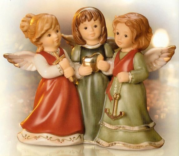 Goebel Weihnacht Drei Himmelsboten - Engel-Trio aus der Kollektion Glaube, Liebe und Hoffnung - von 2008. Farbe: Rot-Grün Winterzauber = Aktionsfarbe des Jahres 2008. Höhe = 13 cm. Wunderschöne und seltene Figur aus dem Hause Goebel. In dieser Farbgebung wurden vom Hersteller nur 1.495 Exemplare gef