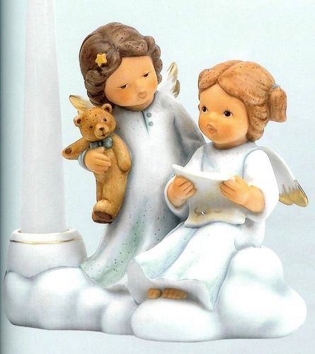 Goebel Nina und Marco Engelpaar auf Wolke - Kerzenleuchter mit 2 Engeln - aus der Kollektion Himmlische Boten von 2008. Höhe = 14 cm. Inklusive Original-Kerze der Firma Goebel. Engel in der Farbe Weiß-Hellblau. Besetzt mit echten Swarovski-Kristallen. Wunderschöne und seltene Figur aus dem Hause Goe