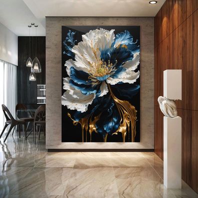 Bild Kunst, Gold und Blau Blumen, Wandbild in Leinwand, Acrylglas oder Poster