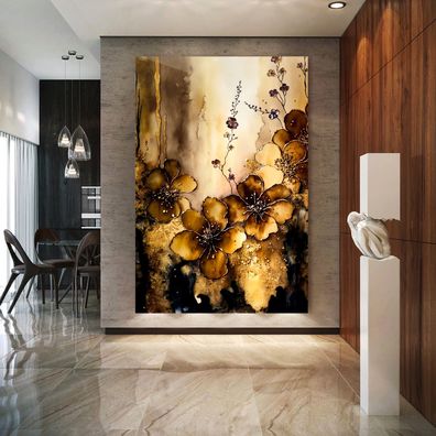 Abstrakte goldene Blumen, Wandbild in Leinwand, Acrylglas oder Poster, Modern Deko