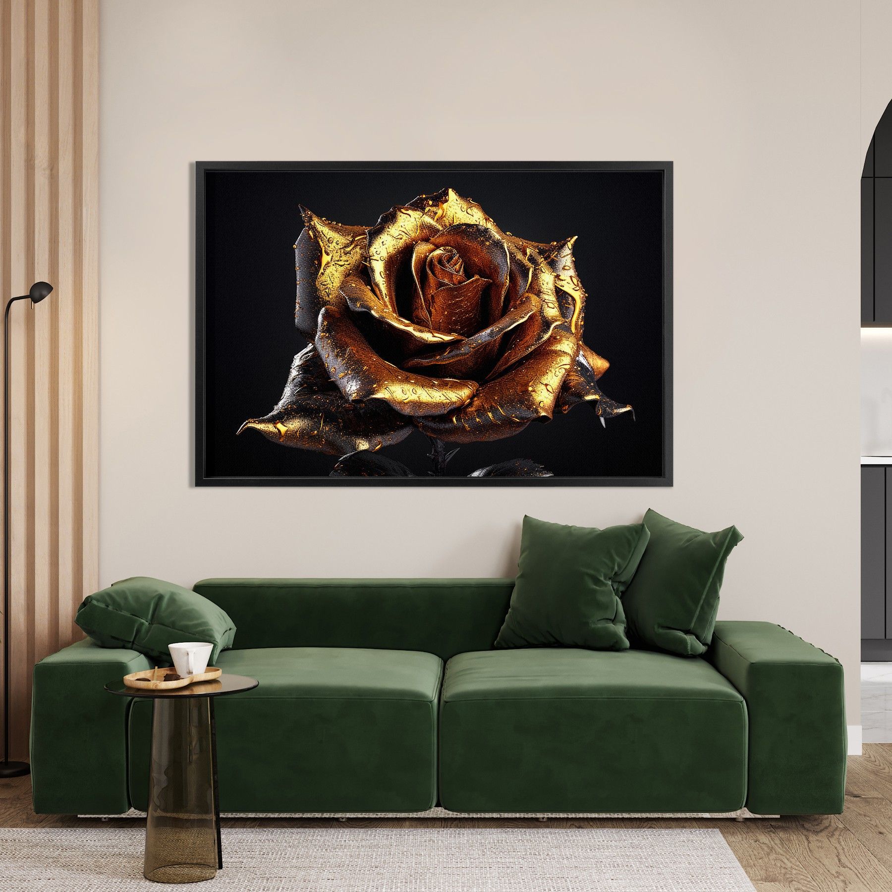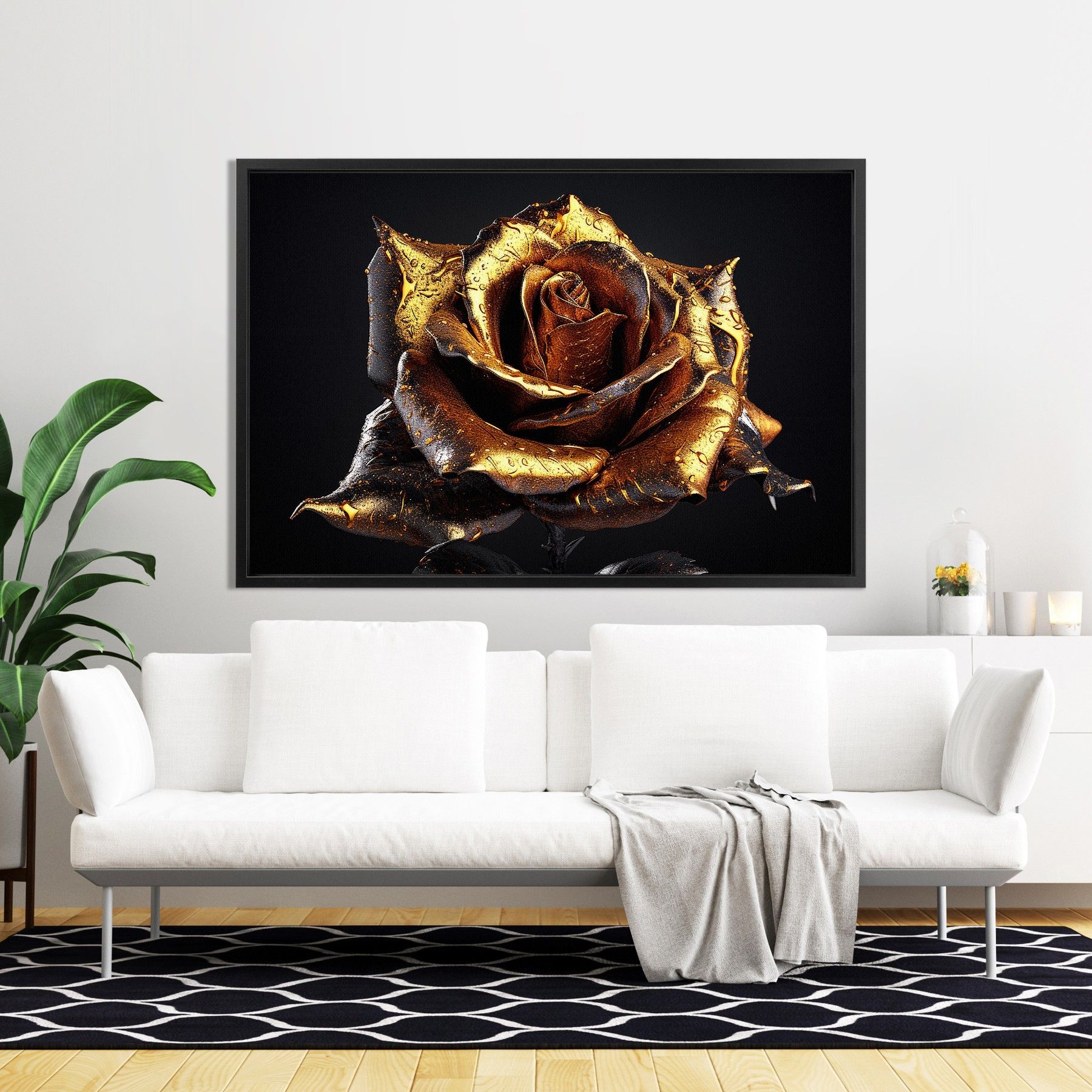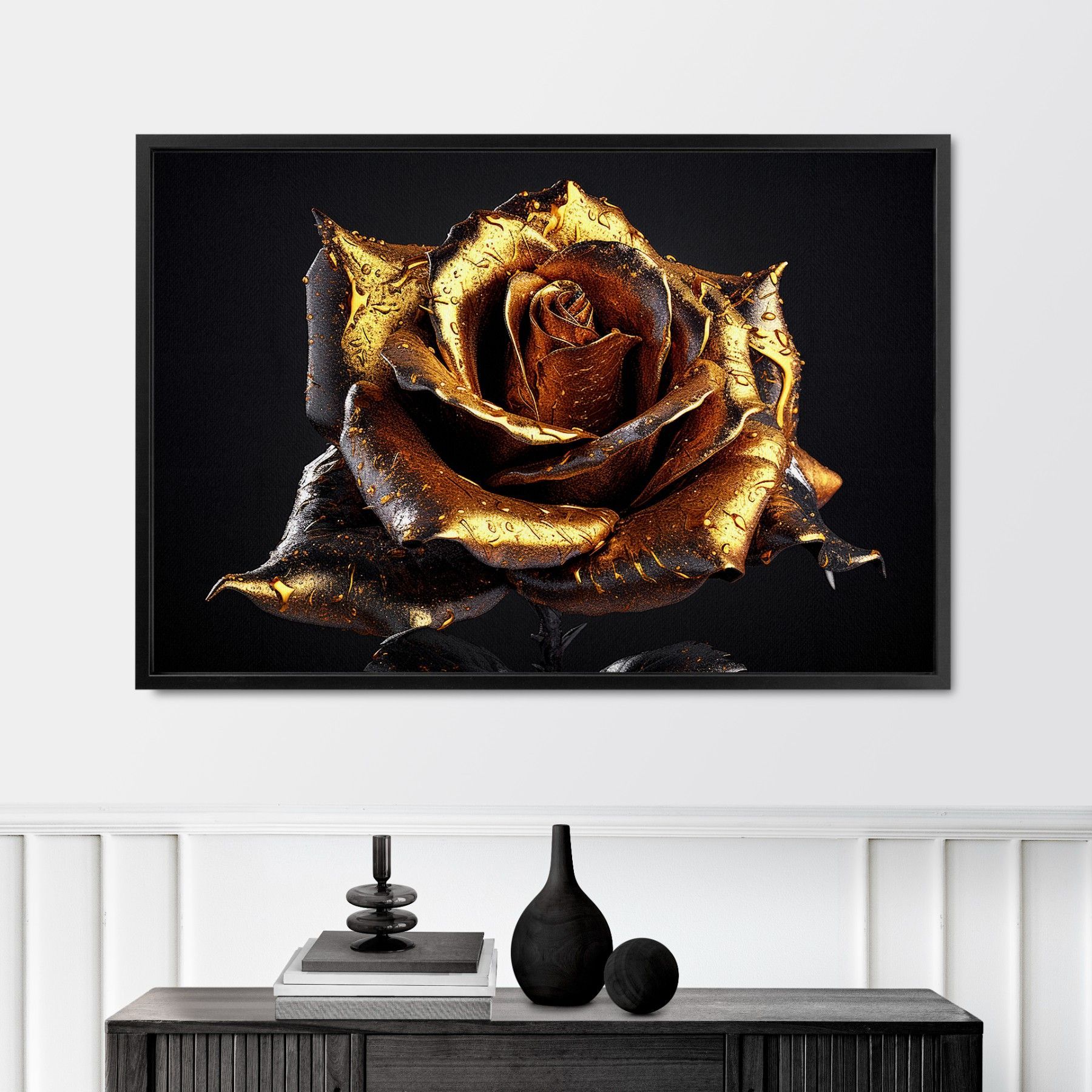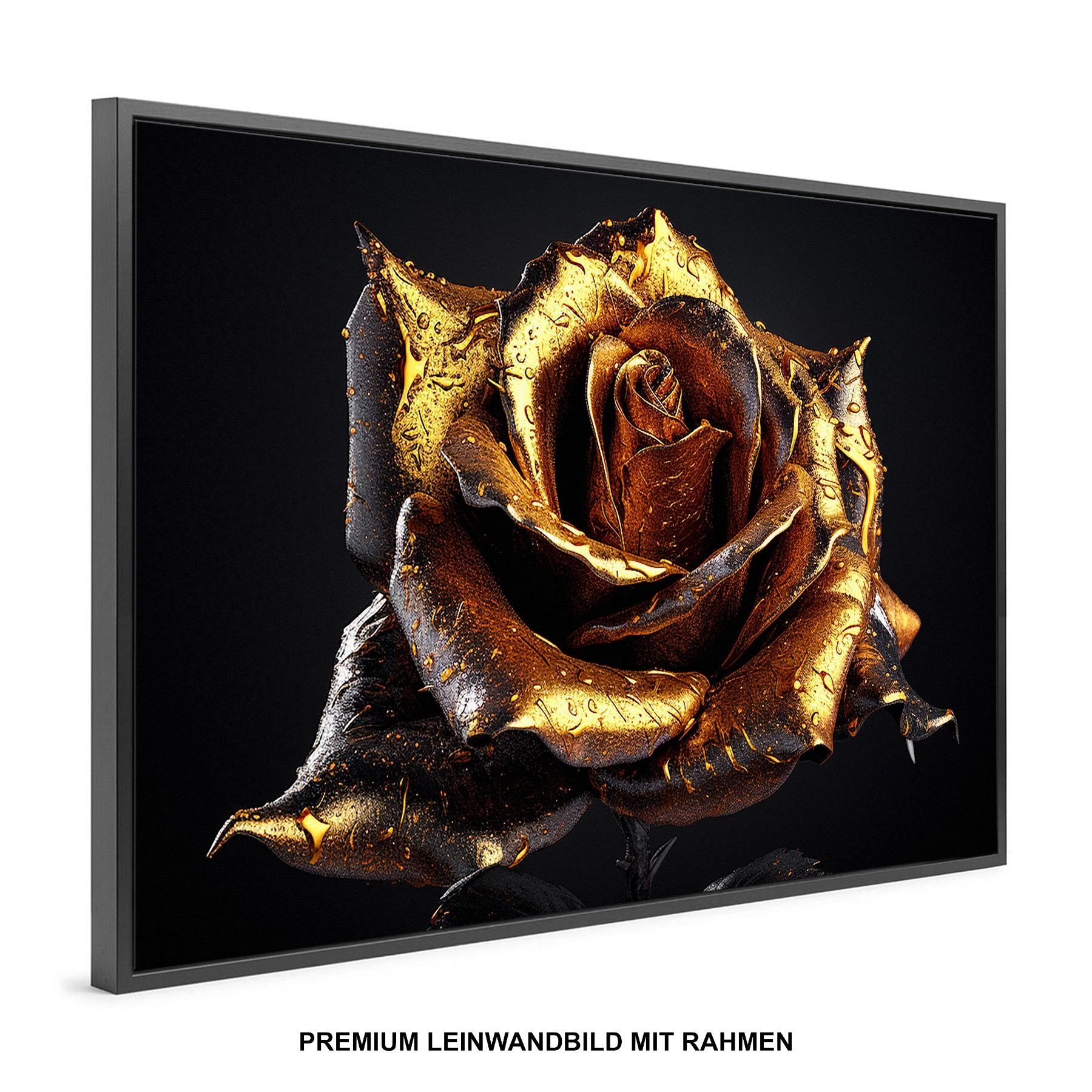 Goldene Rose, Luxus Blume Wandbild Leinwand-Bild mit Rahmen XXL Deko Kunst