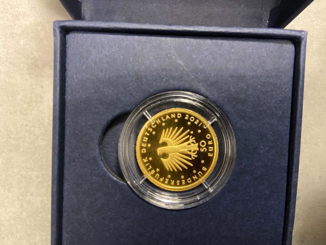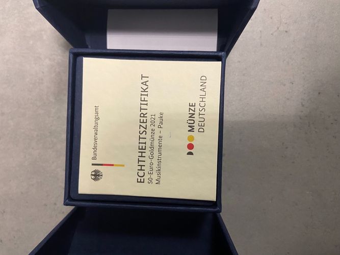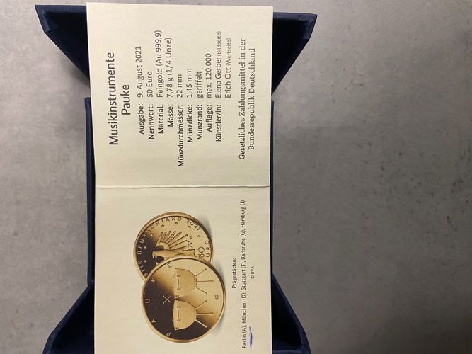 Verkaufe hier aus meiner Sammlung eine Goldmünze der BRD. Es handelt sich um eine 50 Euro Münze aus der Serie Musikinstrumente und zwar um die Pauke. Die Münze hat ein Gewicht von einer 1 4 Unze, was 7,78 Gramm entspricht. Die Münze ist aus 999,9 Feingold und hat einen Durchmesser von 22 mm. Sie ist