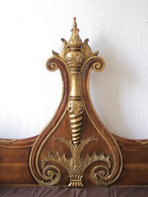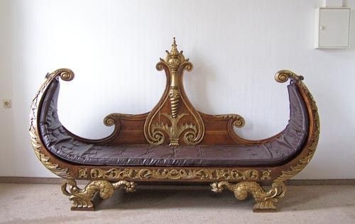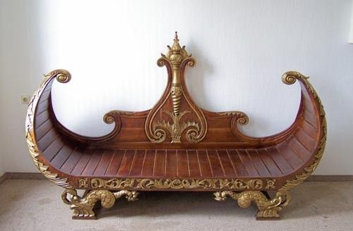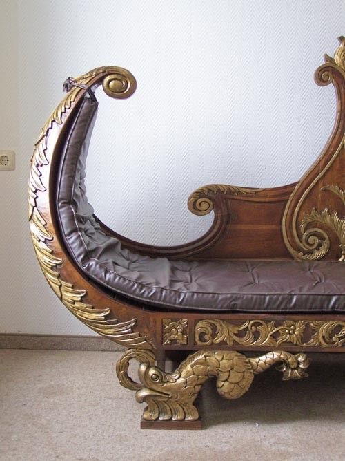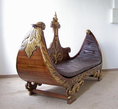 In seiner Art und Weise ist diese aussergewöhnliche Sitzbank etwas ganz besonderes. Gleich ins Auge sticht die gondelartige Formgebung, mit ihren dekorativen Verzierungen und wunderschönen Schnitzereien, die sich goldfarben vom Grundton hervorheben. Die Sitzfläche hat eine braune, lederartige Auflag