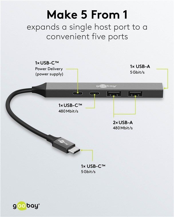Goobay Goobay 74460 Slim 5-Port USB-Hub, USB-C™ auf USB-C™/USB-A, 5 Gbit/s, hellgrau, 0.1 m
