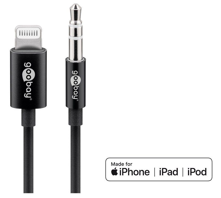 Goobay Apple Lightning Audioanschlusskabel (3,5mm) 1m schwarz, 1 m, Plastiktüte - zum Verbinden eines iPhone iPad mit einem Audiogerät über einen 3,5-mm-Klinkenanschluss unkomplizierter Musikgenuß für zu Hause oder auch im Auto vom iPhone, iPad oder iPod hochauflösende Audiowiedergabe durch einen in