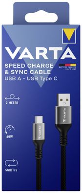 • Varta 57935 101 111 Speed Charge & Sync Kabel USB A auf USB C , 2 m, schwarz