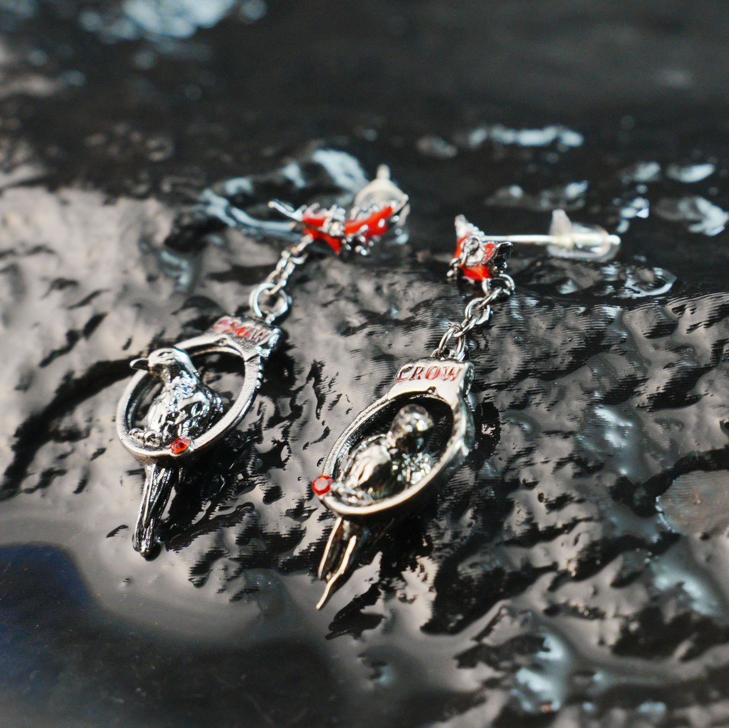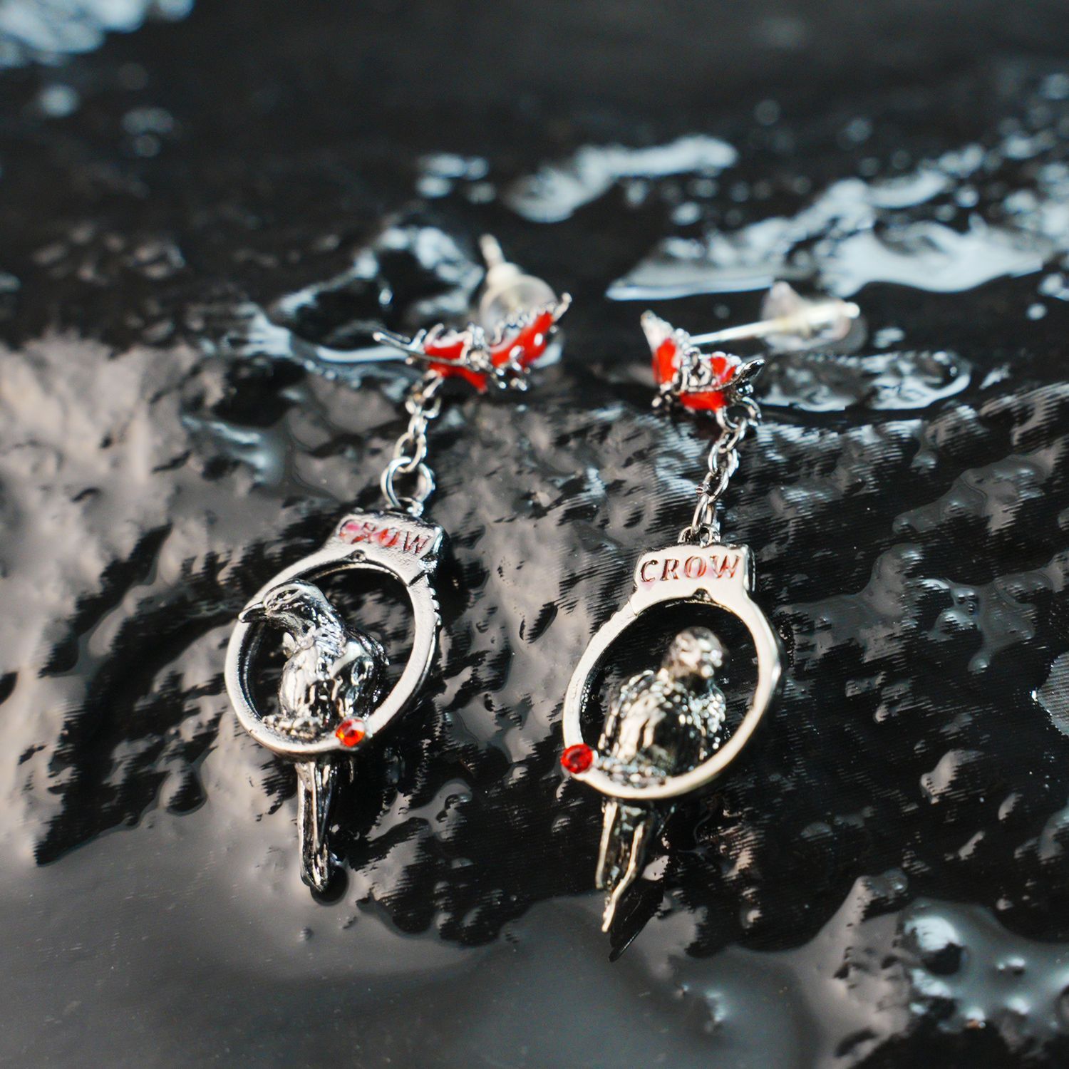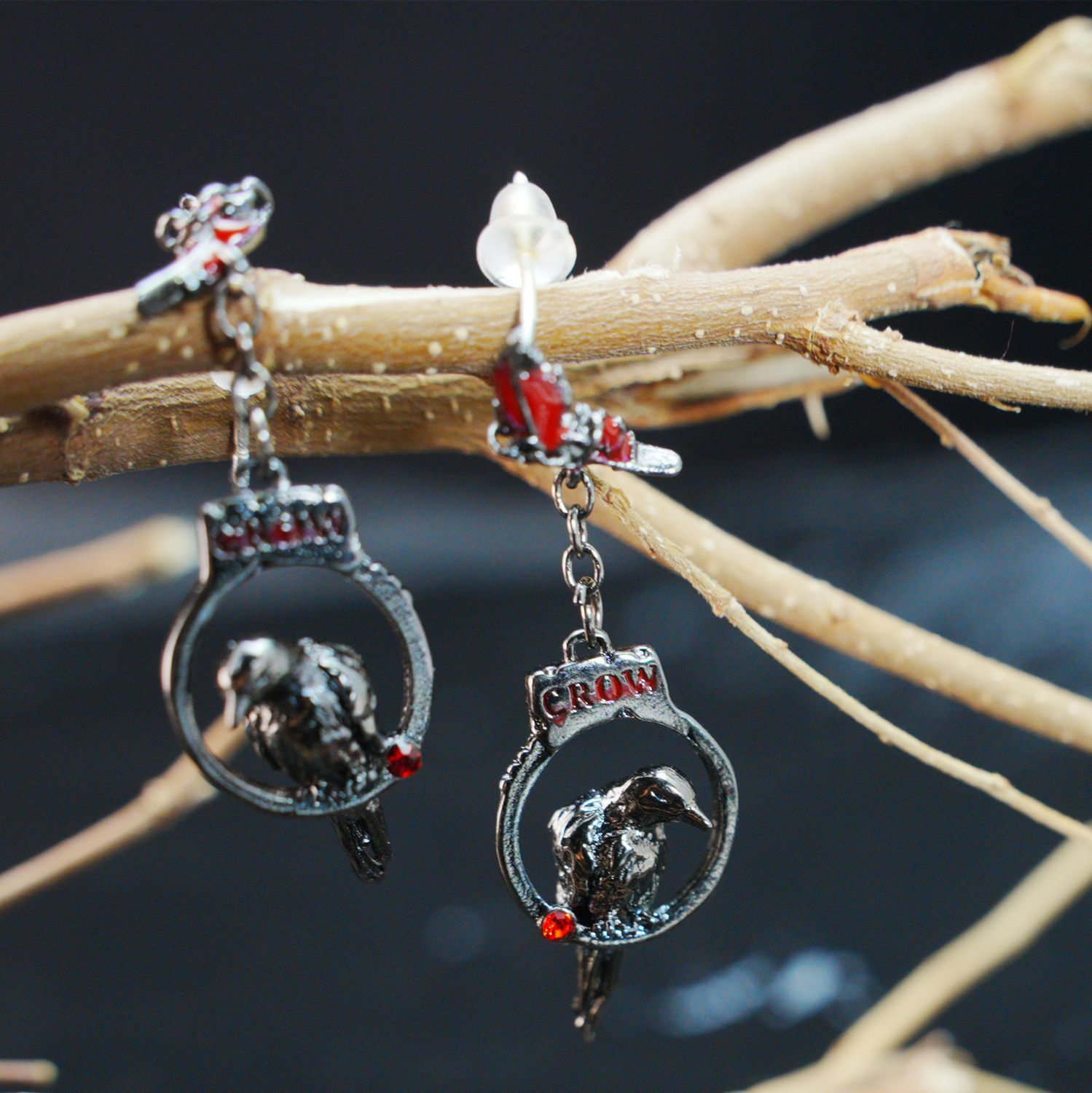 Gothic Raven Drop Earrings with Red Feather Accents | Dark Aesthetic Crow Jewelry | U