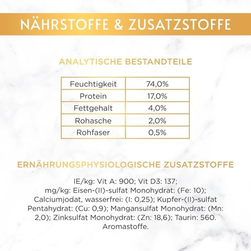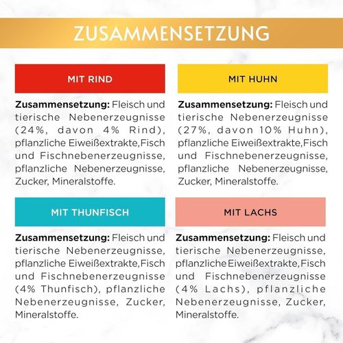 Wet food for adult cats: finely chopped pieces in sauce For more variety: cat food mix in the varieties beef, chicken, salmon and tuna Box contents: bulk pack with 96 individual portions in 4 x 24 x 85 g value pack High-quality cat food without the addition of artificial colours, preservatives and f