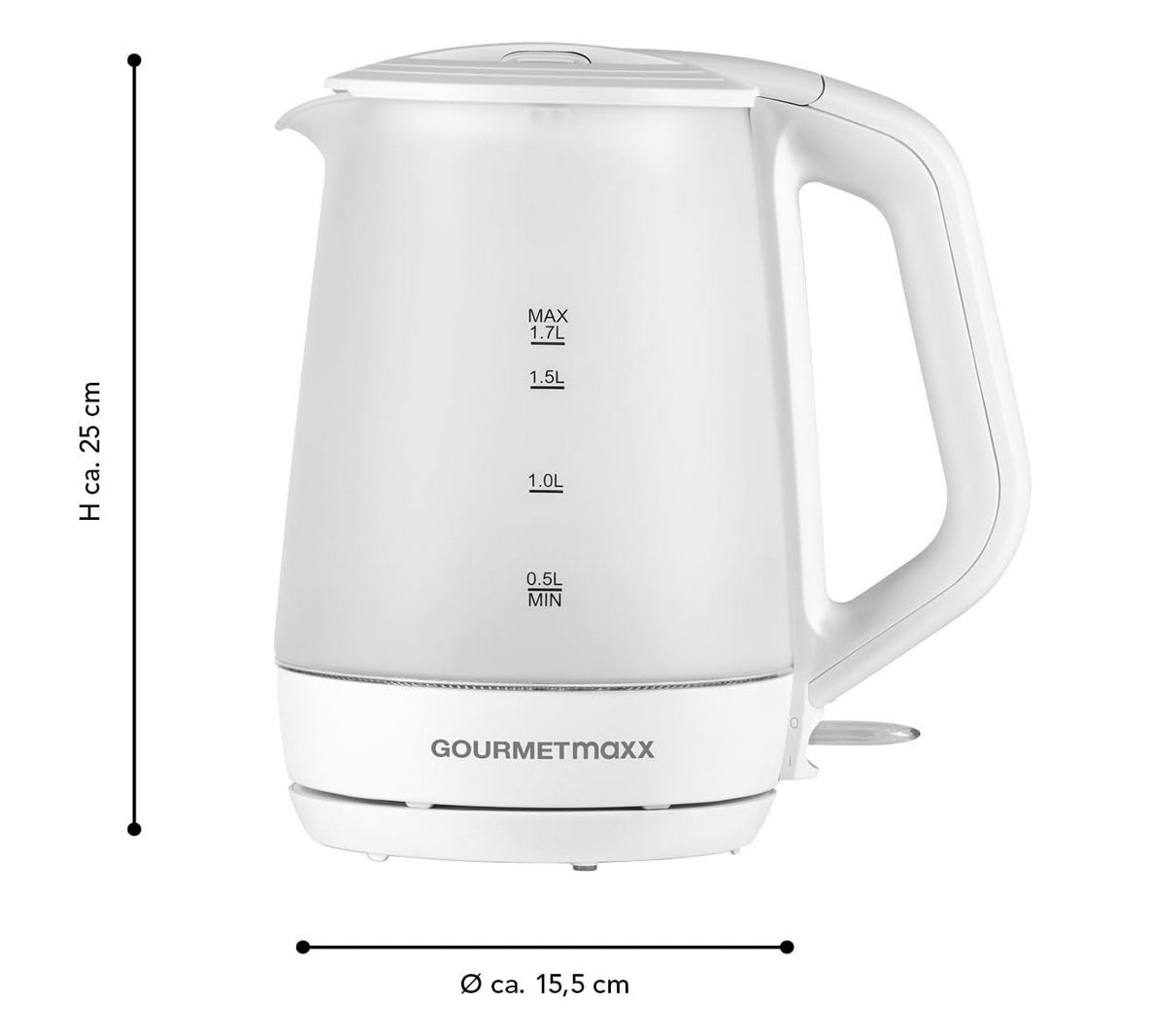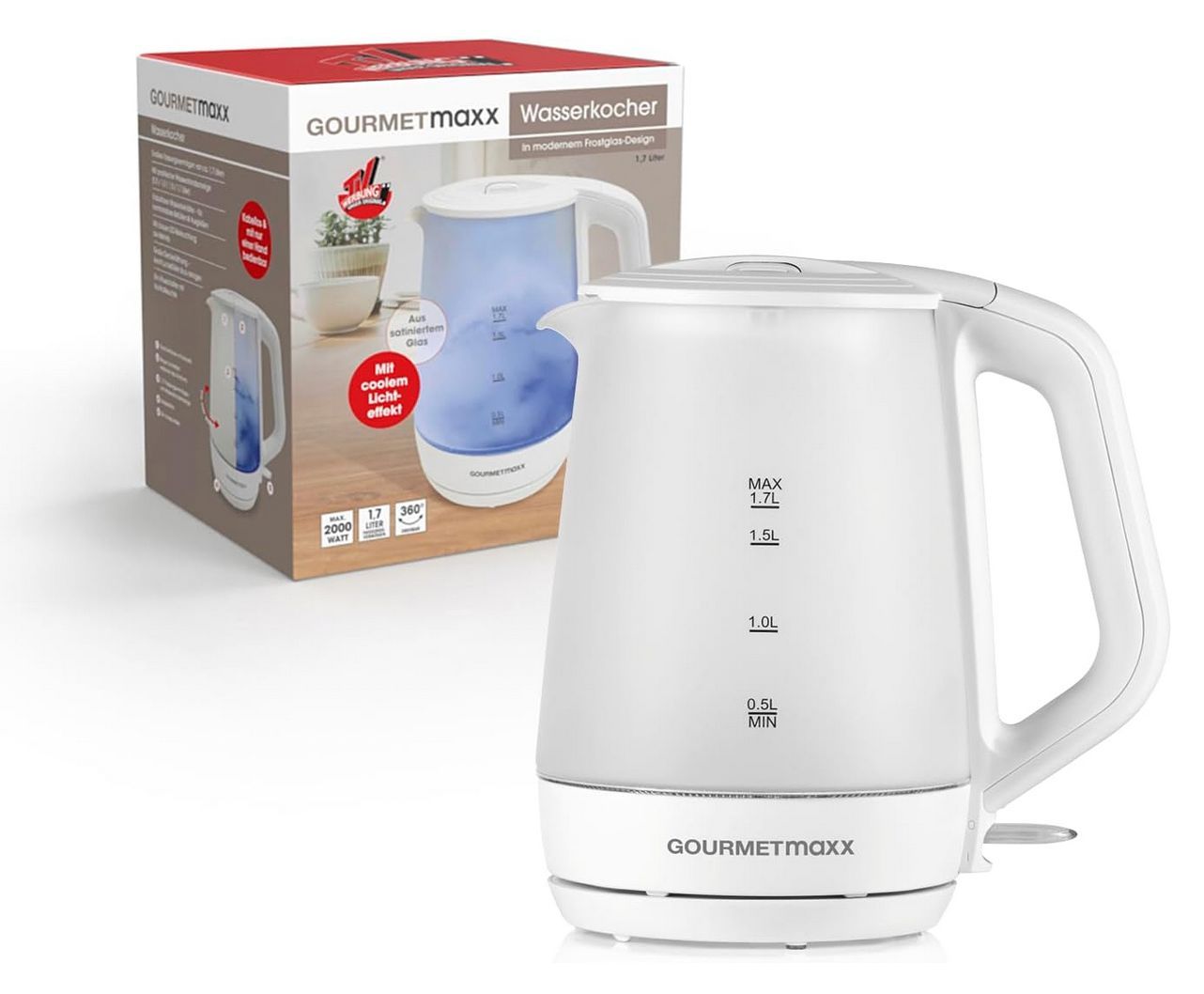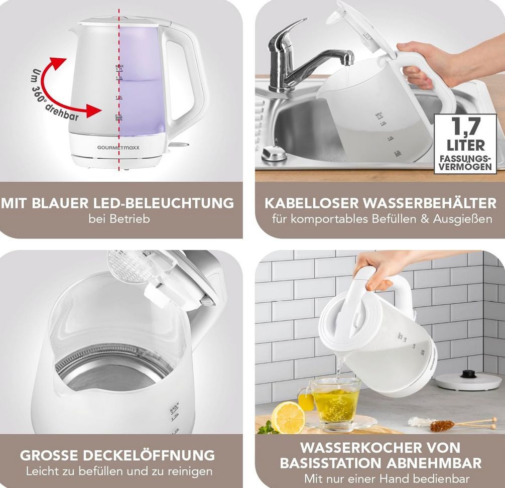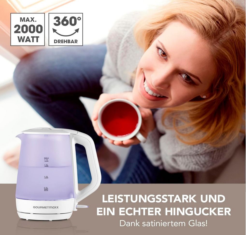 Gourmetmaxx Glas-Wasserkocher 1,7L, 2200W kabellos 360° Bedienkomfort, LEDBeleuchtung
