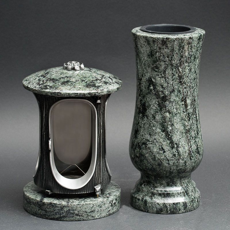 Grab-lampe Grab-vase Grabschmuck Set Grablaterne Friedhofsvase aus Granit Olive green