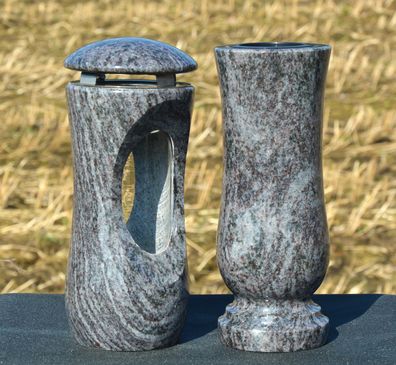 • Grabschmuck-Set Grab-lampe Grabvase Set Vase + Grab-licht aus Granit schlesisch