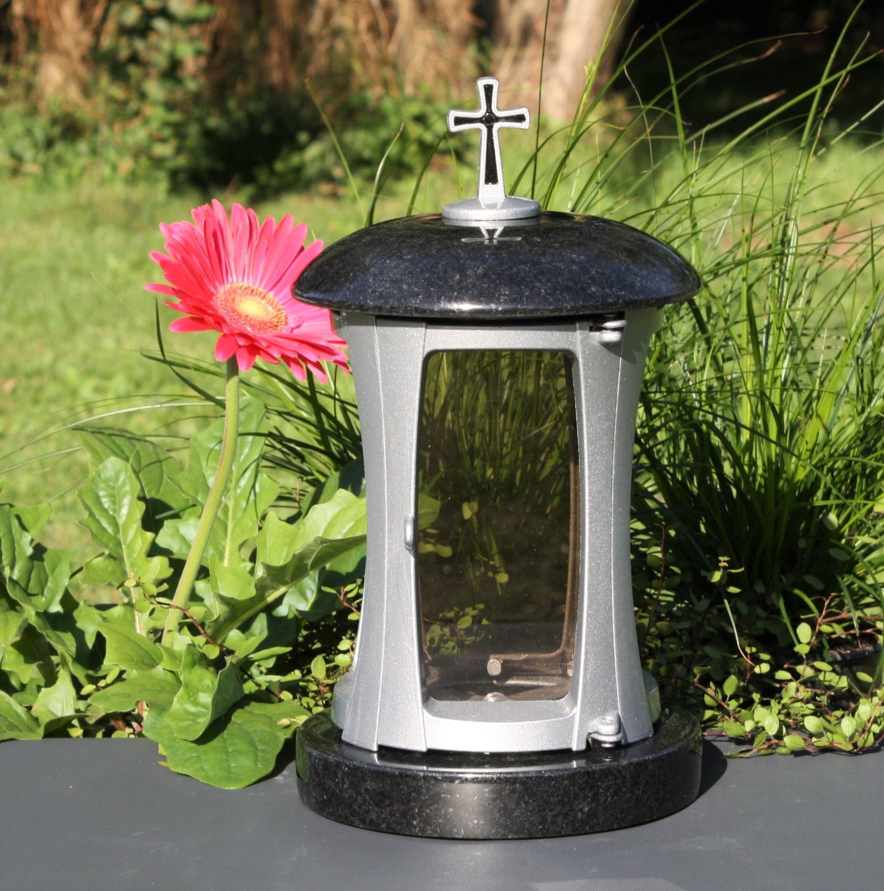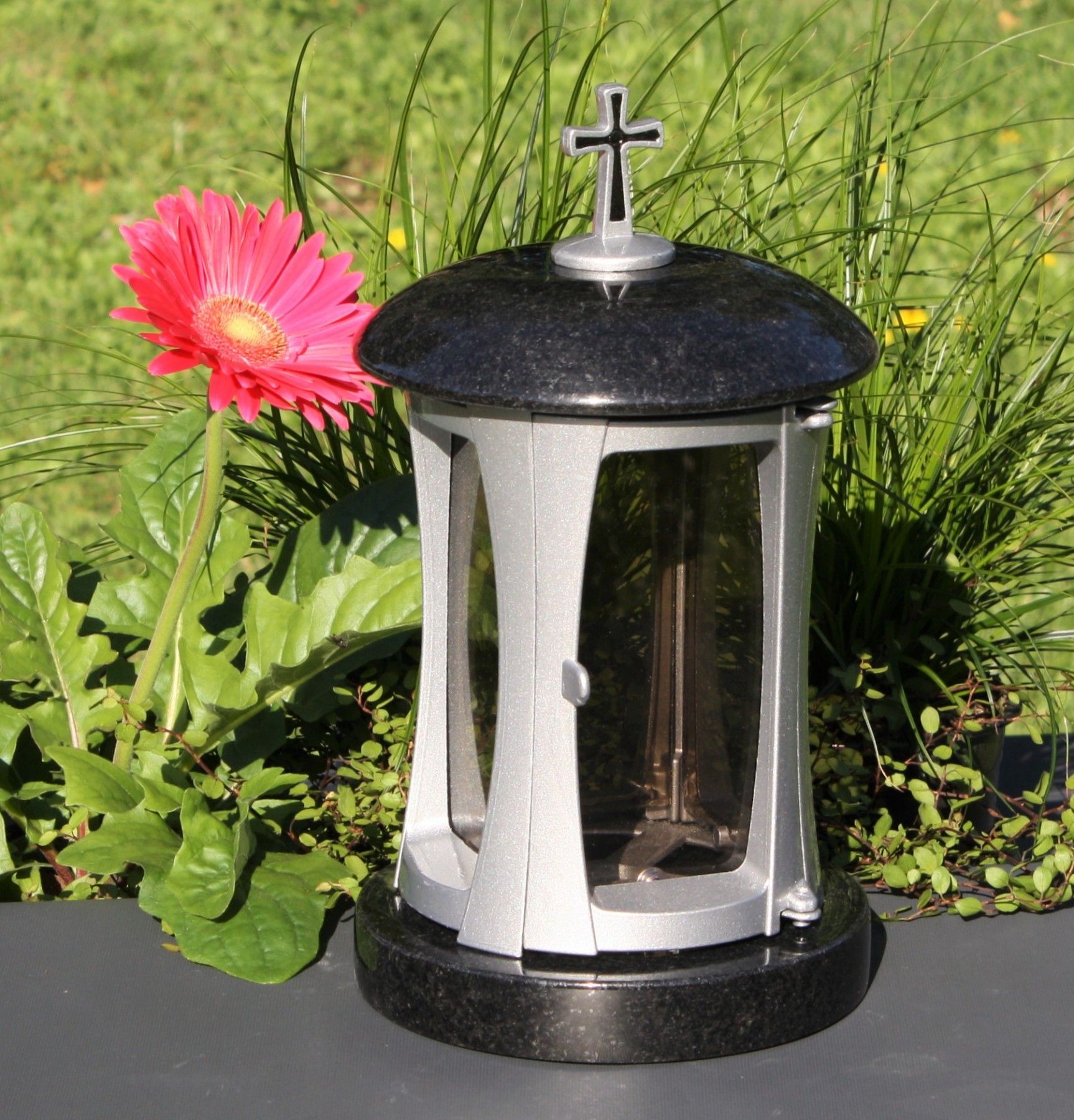Grablaterne mit Kreuz Grablicht Grableuchte Grabschmuck Swedish-Black Granit