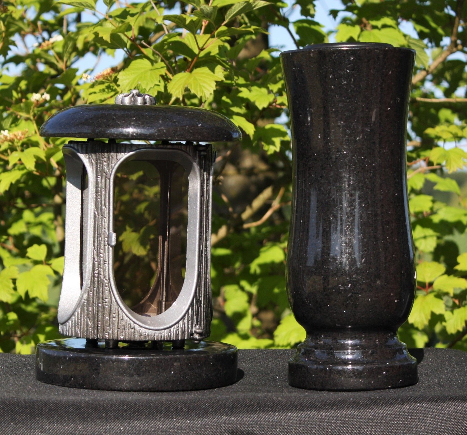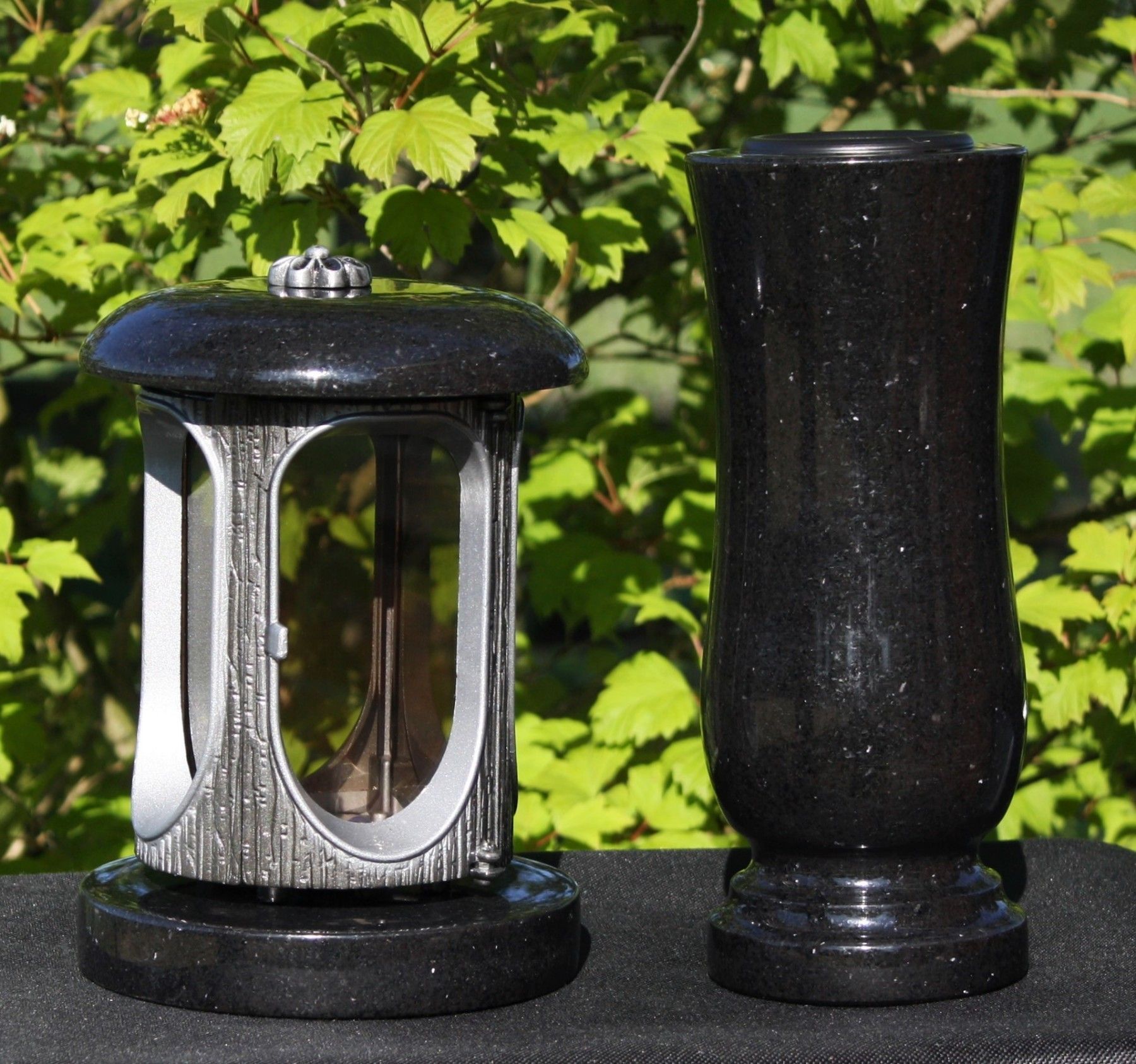 Grablaterne mit Vase aus Granit Schwarz Schwede Grabschmuck
