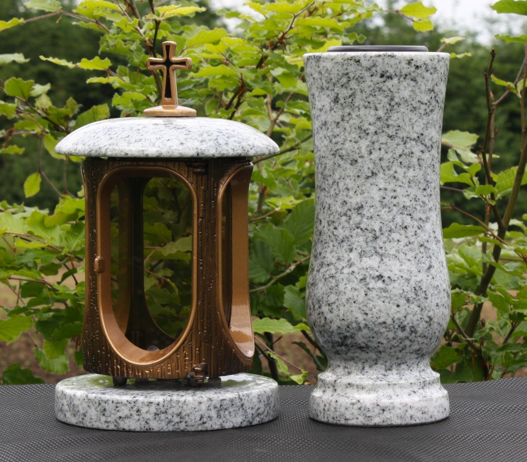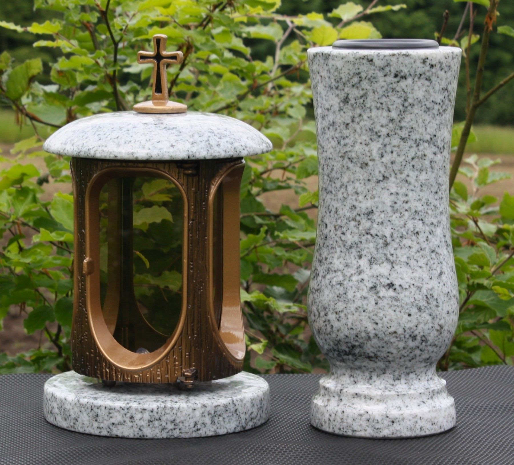 Grablaterne und Vase Blumenvase Granit Viscont Grablampe Grableuchte Grabschmuck