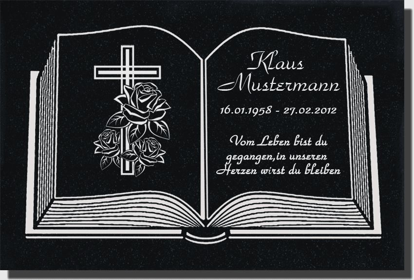 Grabstein Grabplatte aus Granit Motiv + Inschrift Gravur 60x30 cm - buch-g03
